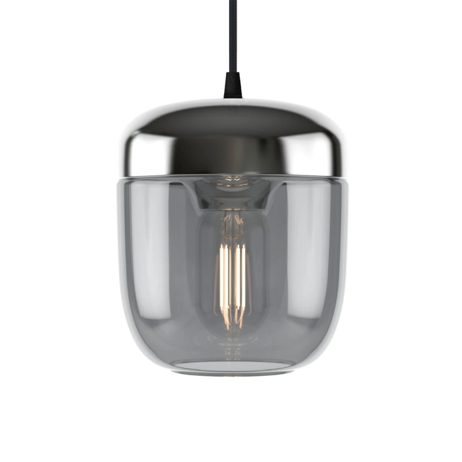 Hängeleuchte Acorn mit metallisch glänzender Abdeckung und rauchgrauem Glas