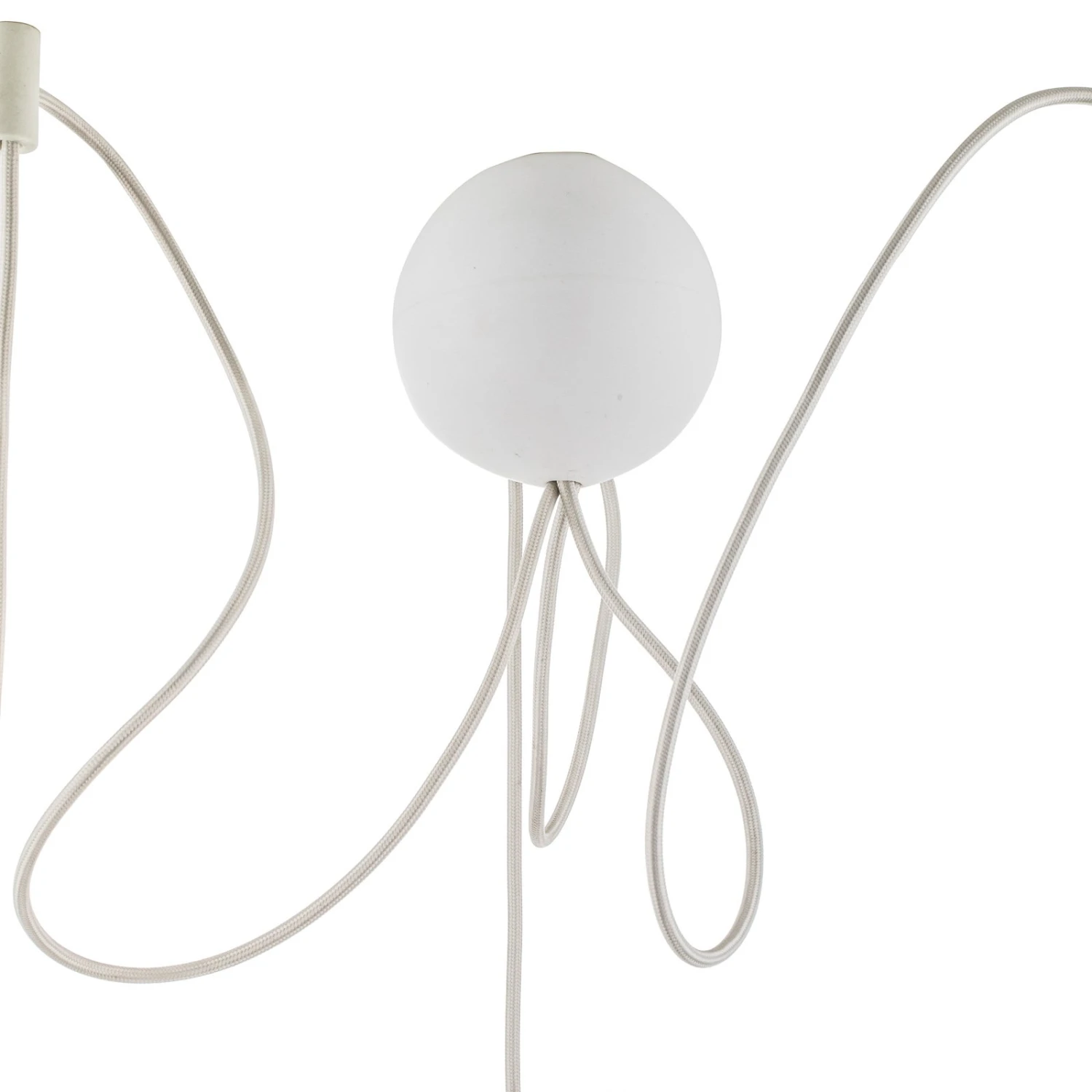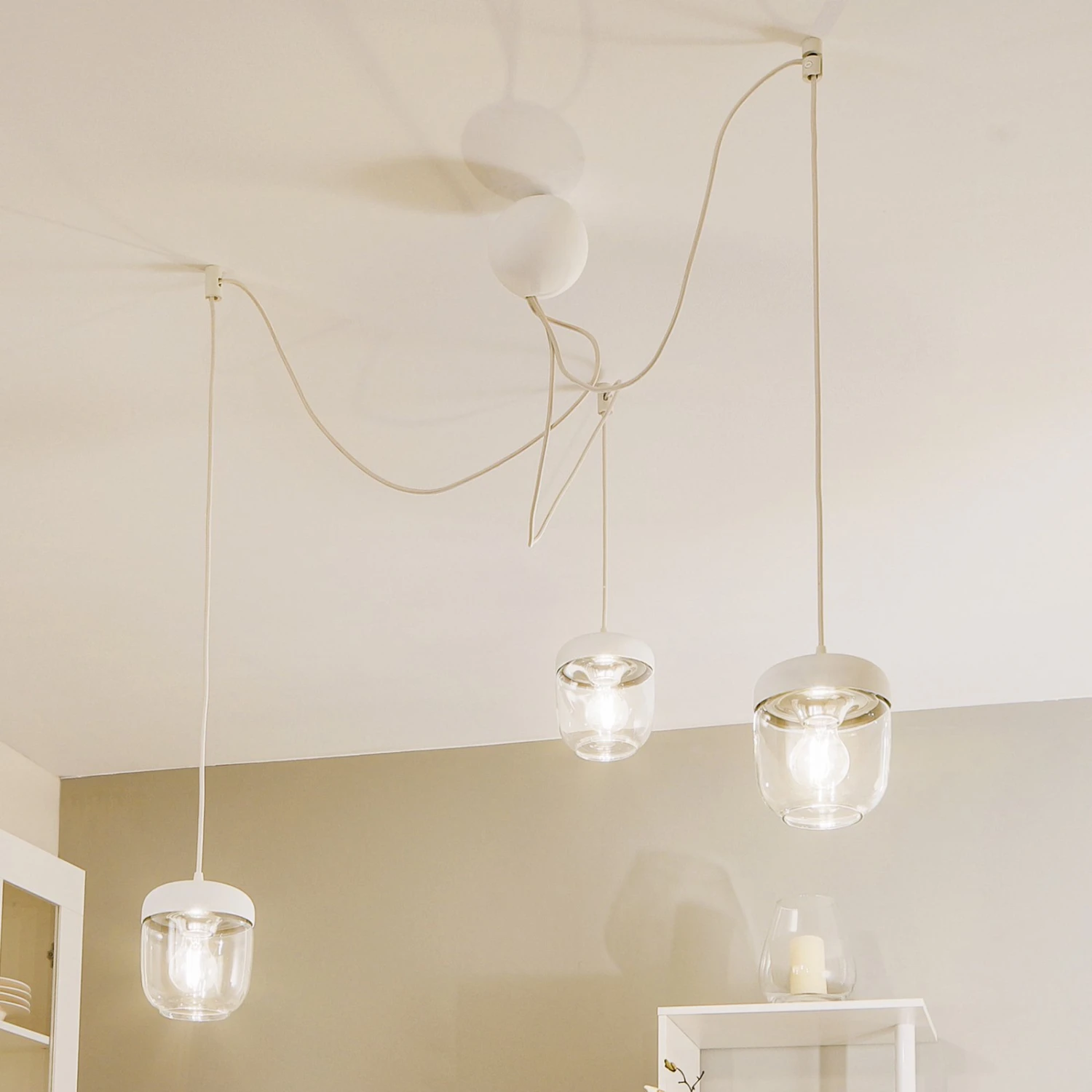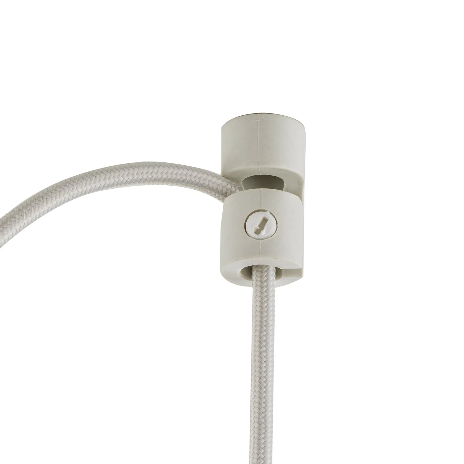 Diese Kombination erweist sich sowohl optisch als auch funktional als sehr vielversprechend: Die Abhängung lässt sich bei der Montage so flexibel handhaben, dass die einzelnen Leuchten unterschiedlich hoch oder aber auch linear befestigt werden können. Von der runden Abdeckung gehen drei Textilkabel ab, deren Länge mit jeweils 250 cm viel Spielraum bietet.