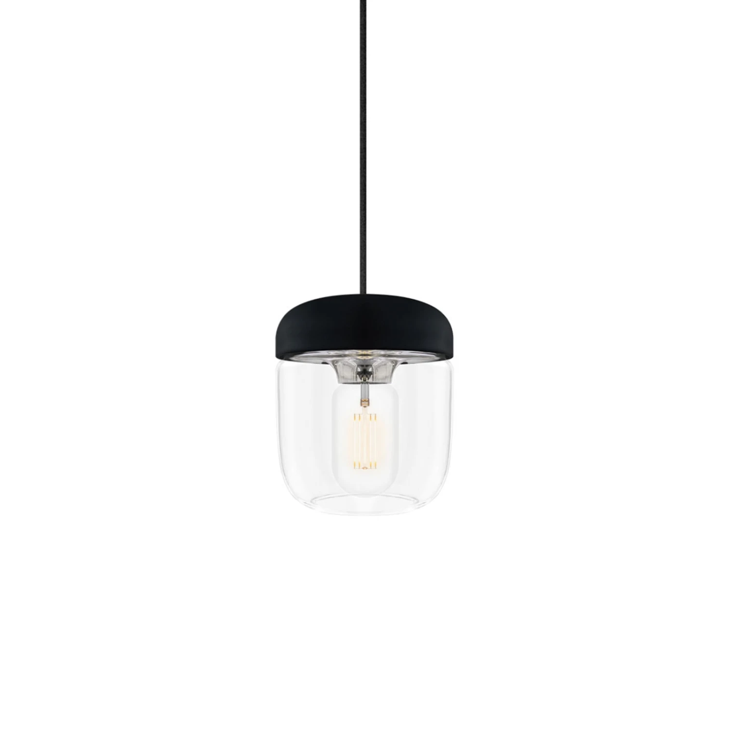 Blickfang bei der Hängelampe Acorn ist der glänzend polierte Stahlkern mit Leuchtmittelfassung. Der Schirm besteht aus einer schwarzen Silikonkappe sowie klarem Glas. Das Leuchtmittel ist rundherum sichtbar, weshalb es sich empfiehlt, ein dekoratives Leuchtmittel, wie z. B. eine Filamentlampe in Glühfadenoptik, zu verwenden.