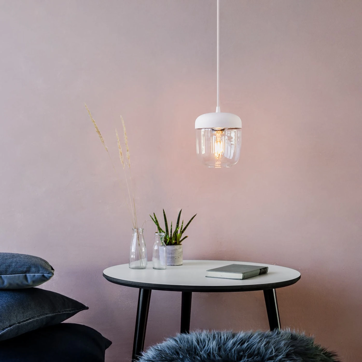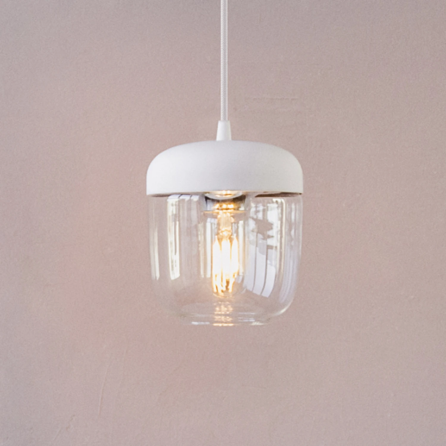 Bei der Pendellampe Acorn, deren Schirm aus drei Teilen besteht – einer weißen Silikonkappe, organisch geformtem, transparentem Glas sowie einem zarten Kern mit messingfarbener Kolorierung – wird dies deutlich. Acorn eignet sich ausgezeichnet dazu, beispielsweise einen Esstisch mit sanft schimmerndem Licht behaglich auszuleuchten und so eine stimmungsvolle Atmosphäre zu schaffen.