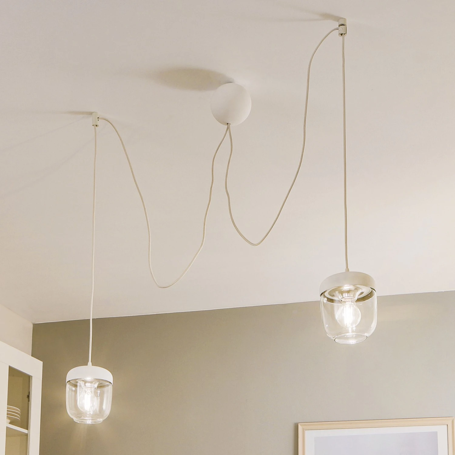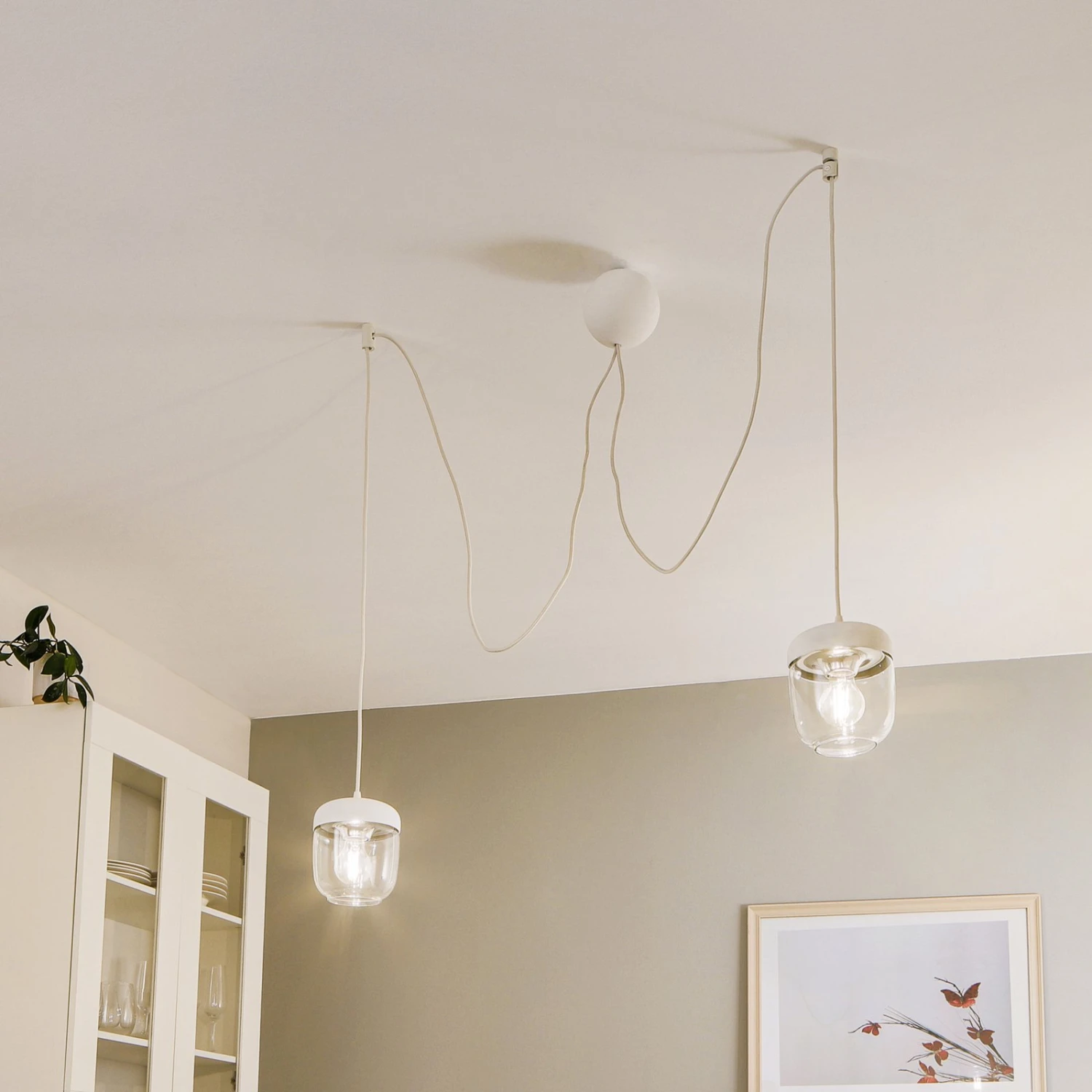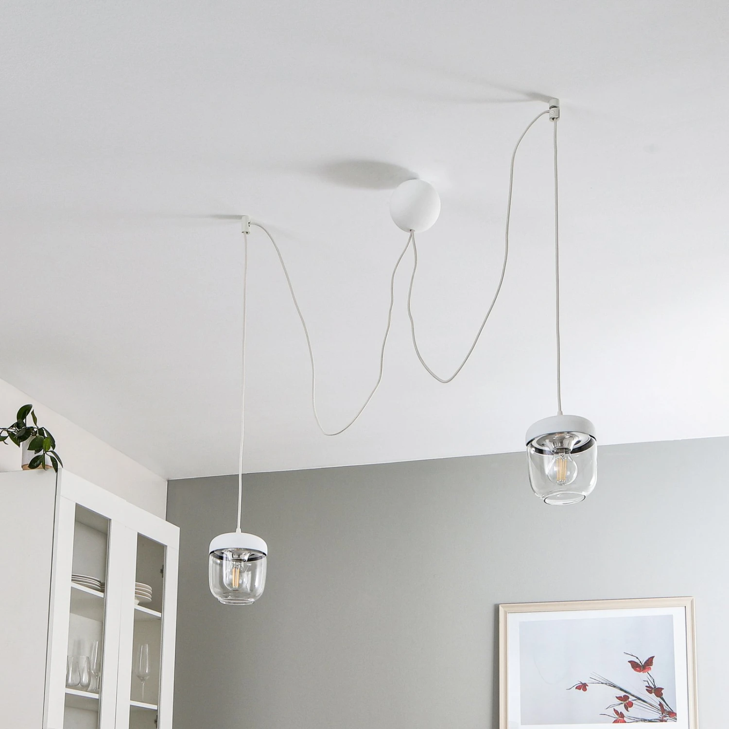 Eine dekorative Pendelleuchte, die sich hervorragend für die gemütliche Ausleuchtung eines Esstisches eignet. Die Abhängung ermöglicht es, zwei Pendelleuchten linear oder in verschiedenen Höhen an der Decke zu befestigen.