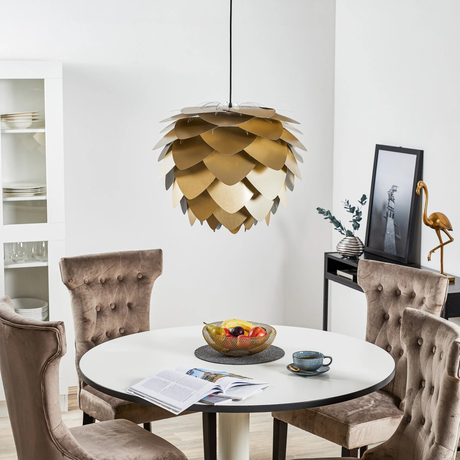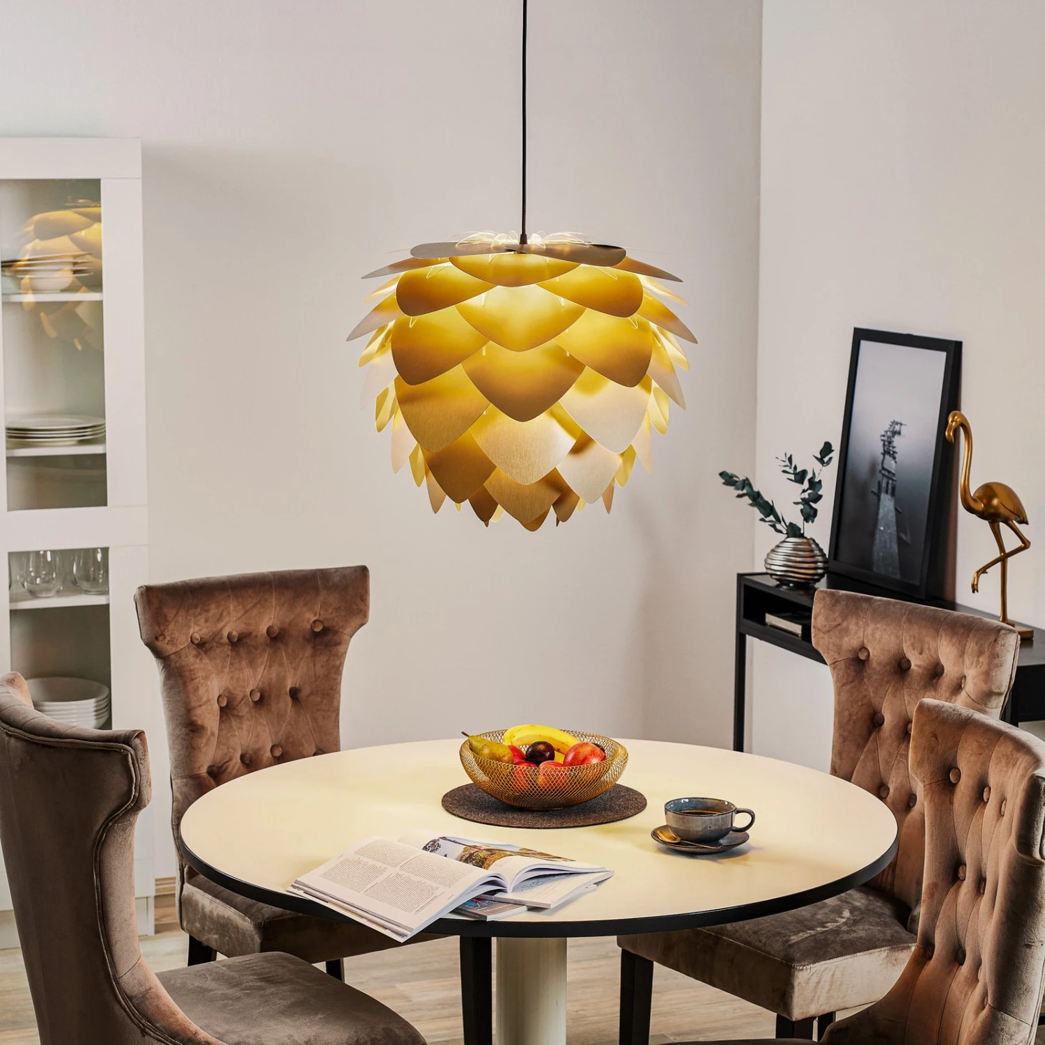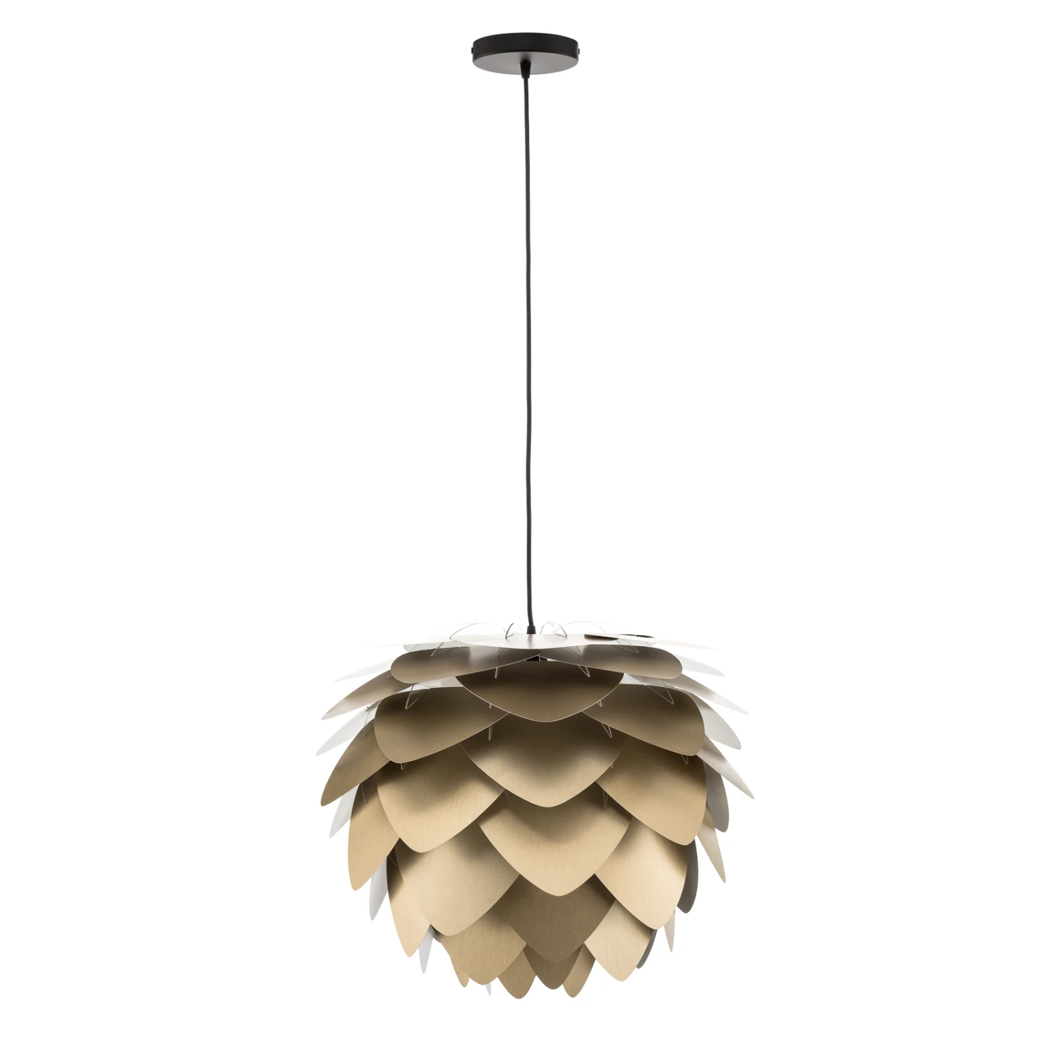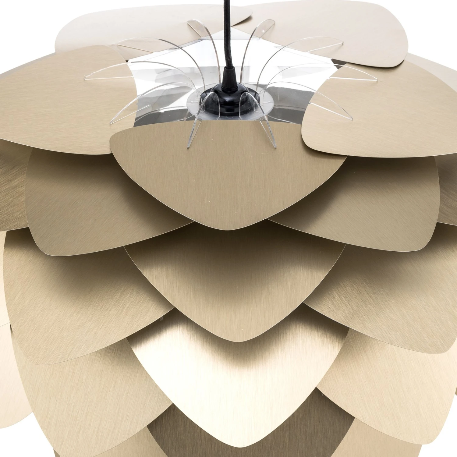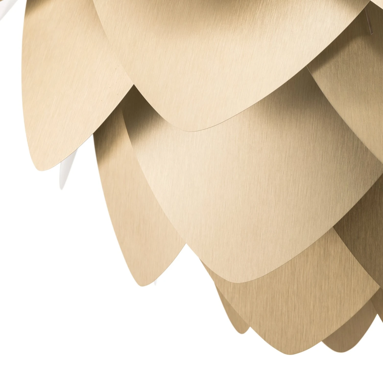 Mit Aluvia medium hat die Design-Schmiede des dänischen Herstellers UMAGE einen attraktiven Hingucker geschaffen. Die Hängeleuchte erinnert an eine gigantische Blüte einer exotischen Pflanze. Die sich überlappenden Blätter aus Aluminium erstrahlen in gebürstetem Messing und verströmen einen edlen Glanz.