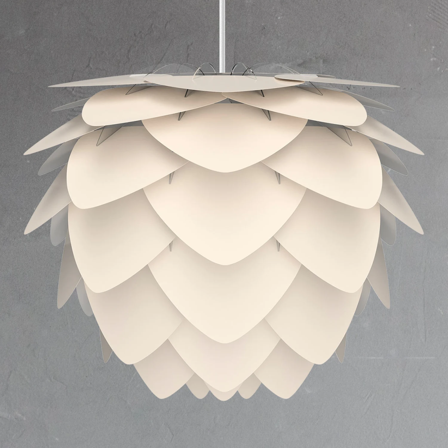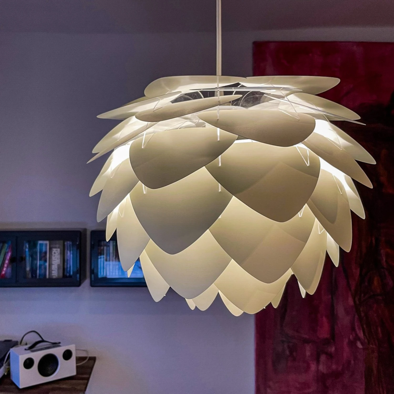 Optisch weckt die Hängeleuchte Aluvia mit dem aus Aluminiumblättern bestehenden Schirm durchaus Assoziationen mit einer exotischen Frucht. Die Aluminiumelemente machen die Hängeleuchte leicht und dennoch robust. Die perlmuttfarbene Lackierung der Blätter verleiht dem abstrahlenden Licht einen sanften, gemütlichen Schimmer.