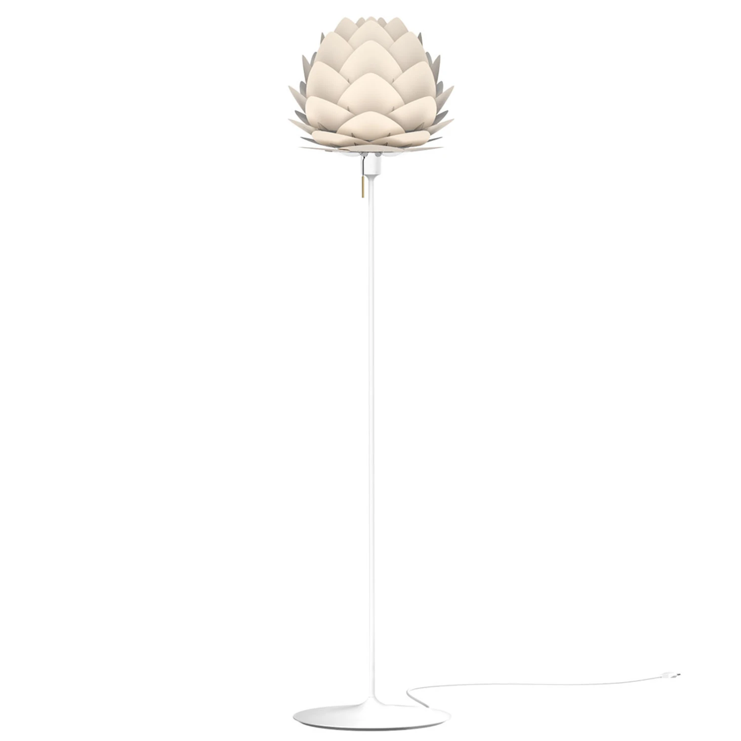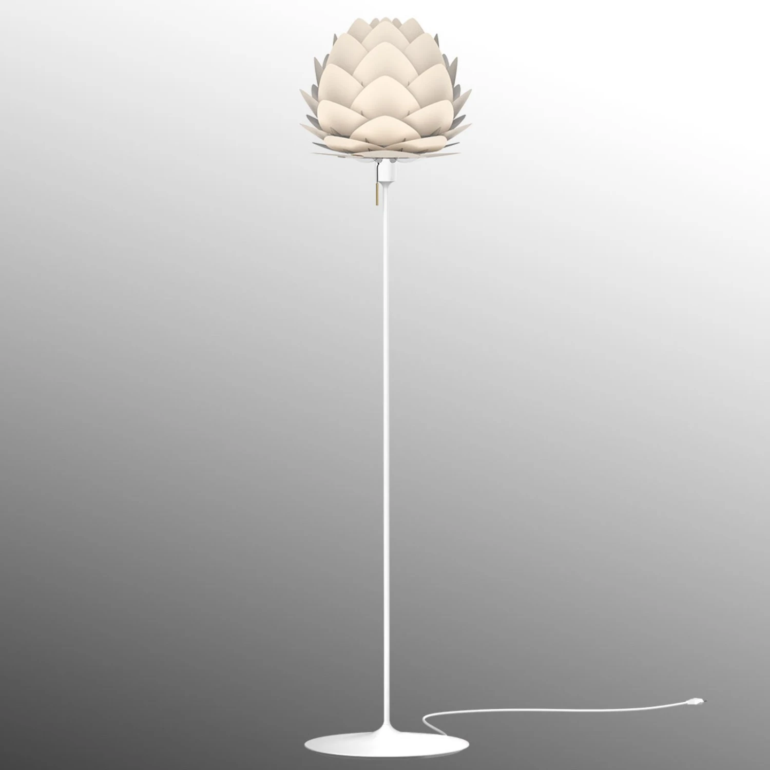 Die elegante und zugleich sehr moderne Stehleuchte besteht aus dem perlmuttfarbenen Aluminiumschirm Aluvia und einem schlanken Bodenstativ in Weiß. Der charakteristische Schirm wurde von dem dänischen Designer Søren Ravn Christensen entworfen, der gleichzeitig Mitbegründer des Labels UMAGE by Vita Copenhagen ist. Das dänische Unternehmen widmet sich der Produktion hochwertiger Leuchten und entwickelt einzigartige skandinavische Designs.