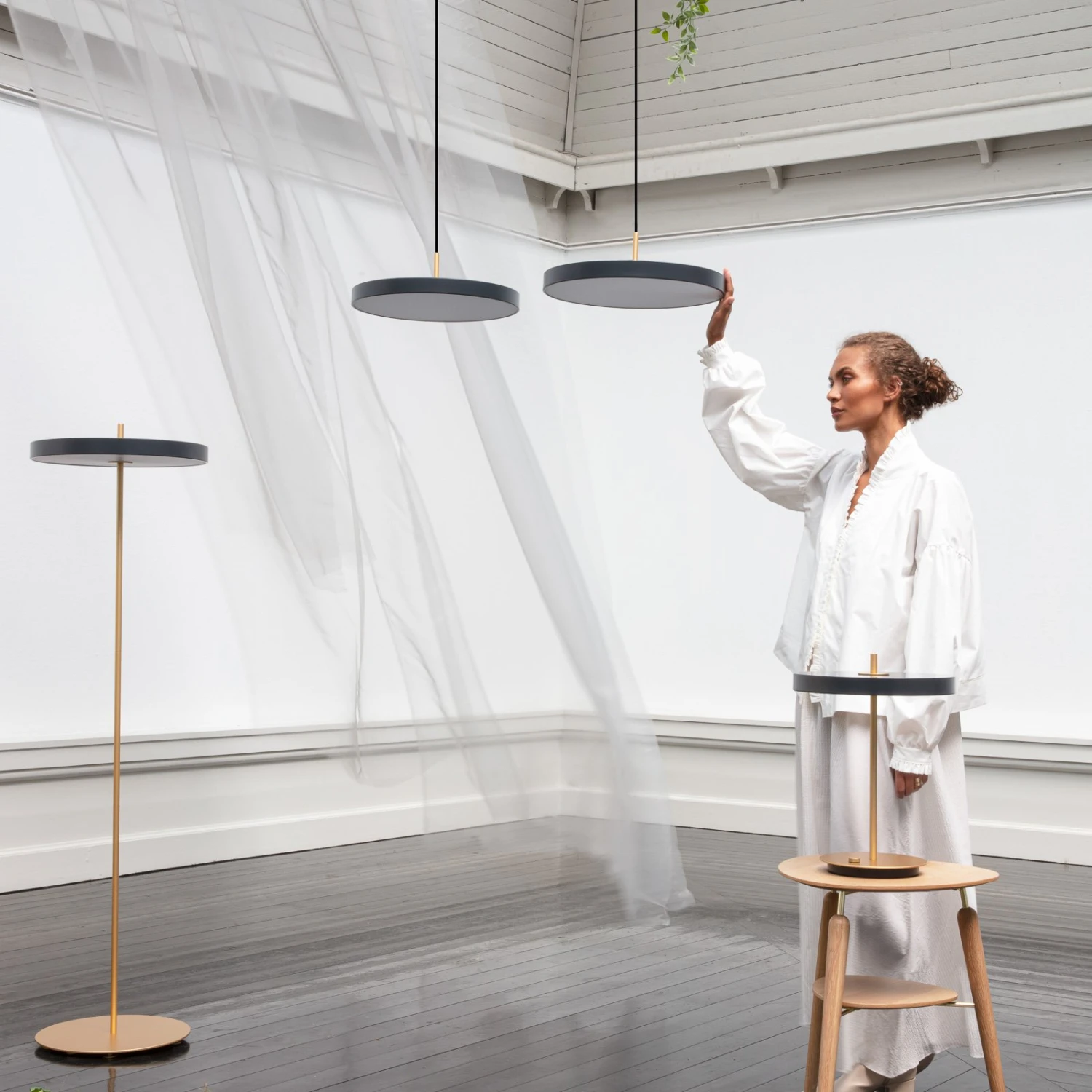 Schwarz mit einem kleinen Tupfer Messing, so gestaltet bietet die LED-Hängeleuchte Asteria einen eleganten und stilvollen Anblick. Ihr Lampenschirm ist dabei schlicht und minimalistisch in Form einer Scheibe designt, die im Inneren mit modernster LED-Technik bestückt ist. Diese gibt ein sanftes, warmweiß strahlendes Licht nach unten hin ab, das zudem bequem gedimmt werden kann. Dies sorgt für eine stimmungsvolle Ausleuchtung mit behaglicher Atmosphäre, zum Beispiel oberhalb eines Tisches.