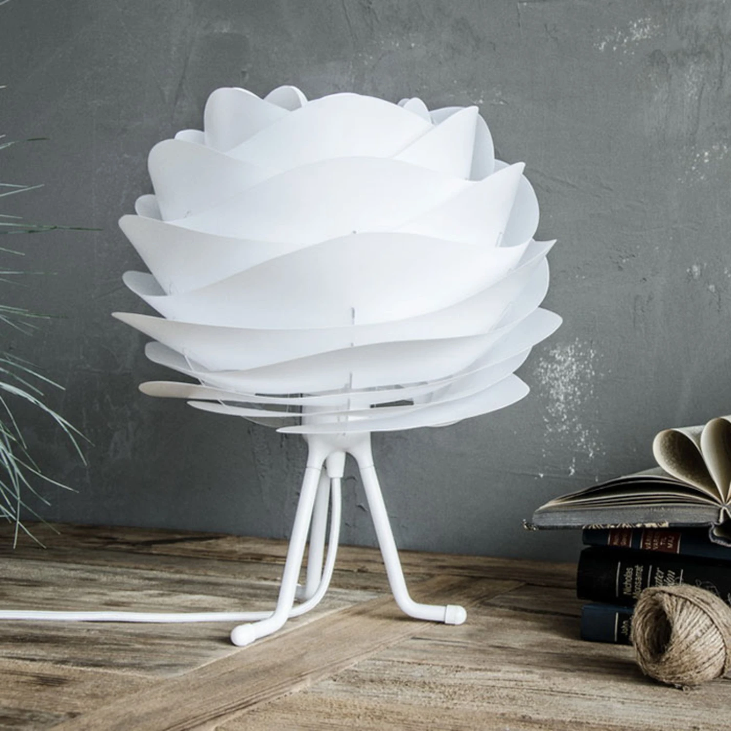 Ausgestattet mit einem auffälligen Schirm und einem stabilen, zurückhaltenden Fuß eignet sich die Tischleuchte Carmina Mini für nahezu jeden Einrichtungsstil. Der Schirm besteht aus unterschiedlichen Bestandteilen, die wellenförmig und in klaren Linien übereinander gesteckt werden. Der Designer ließ sich hier von den Wellen und Dünen an der dänischen Küste inspirieren und bringt somit einen Teil des skandinavischen Lebensgefühls in die eigenen vier Wände. Die geschwungenen Bestandteile sind unzerbrechlich und hochwertig verarbeitet. Sie lassen das Licht durch die Zwischenräume nach allen Seiten austreten, wodurch sich ein faszinierendes Lichtbild ergibt.