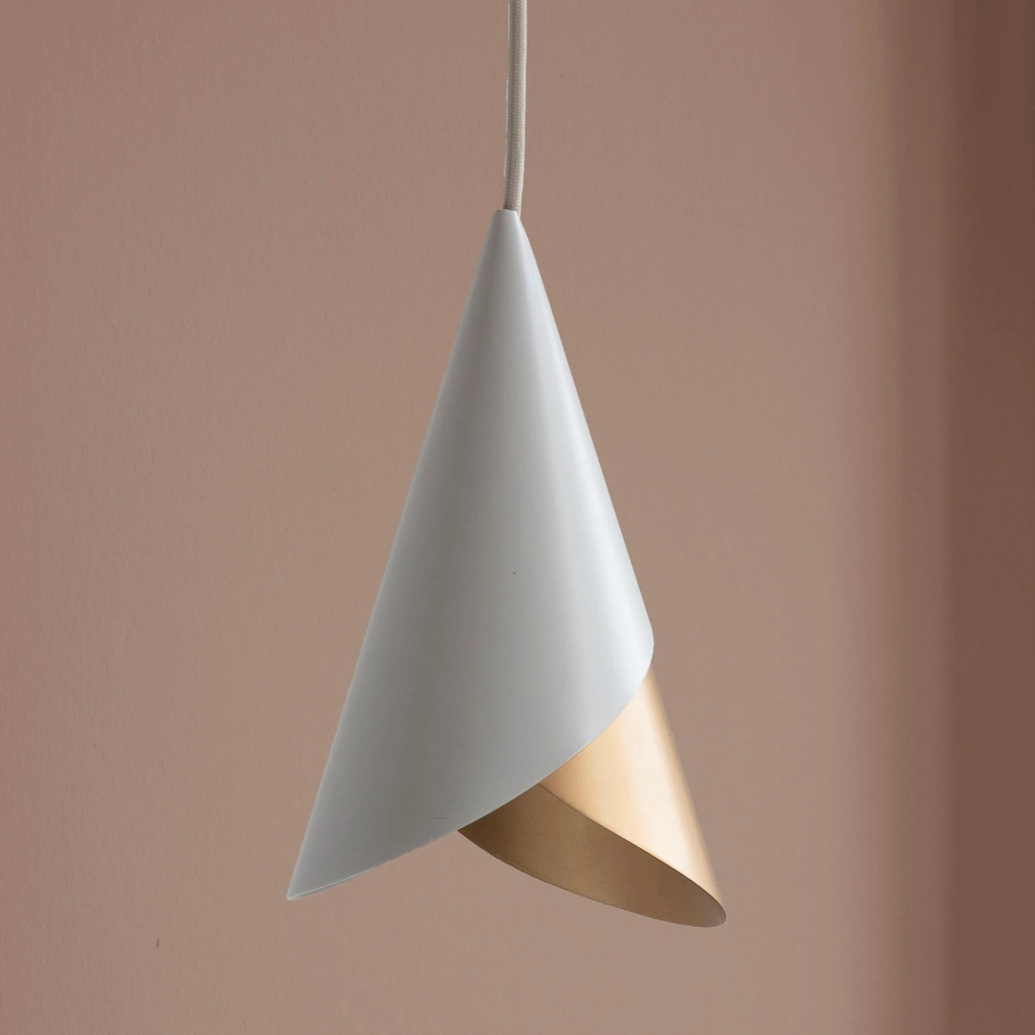 Cornet – diesen Namen verdankt die Designer-Hängeleuchte zweifellos ihrer Schirmform, die sofort Assoziationen an eine Eistüte weckt. Wie eben diese Eistüten wurde auch der Schirm der Leuchte in spitz zulaufender Form gerollt, und zwar eine Lage aus messingfarben, die andere Lage aus weiß lackiertem Aluminium.