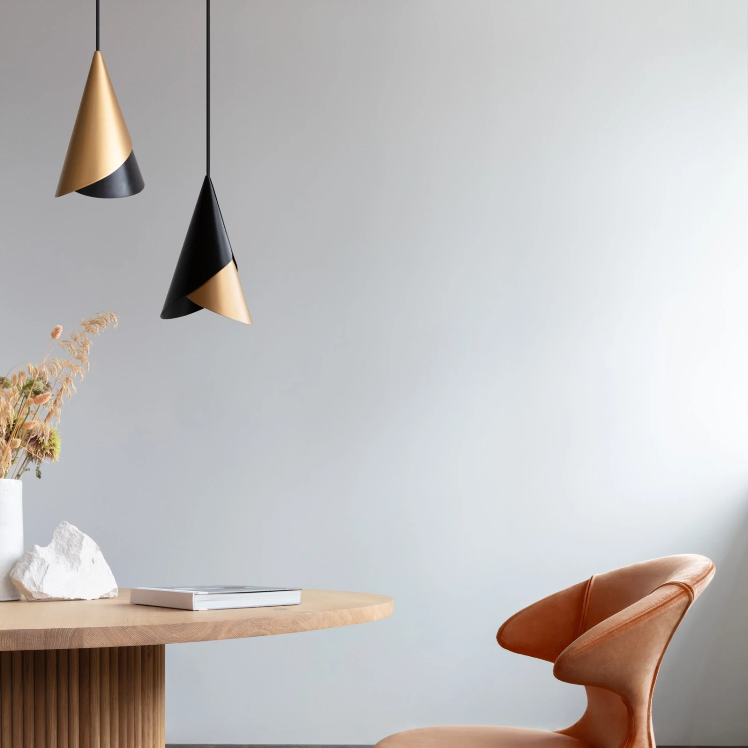 Zwei Einzelschirme übereinander bilden den Schirm der Hängeleuchte Cornet, die, wie der Name schon vermuten lässt, Gedanken an eine Eis-Waffeltüte aufkommen lässt, deren Form der Schirm gleicht. Zwei dieser Schirme, einer in schwarzer und einer in messingfarbener Lackierung, wurden übereinandergestülpt. Sie lassen sich jedoch auch in der Anordnung umkehren oder komplett auseinandernehmen, sodass die Optik des Schirms jederzeit verändert werden kann.