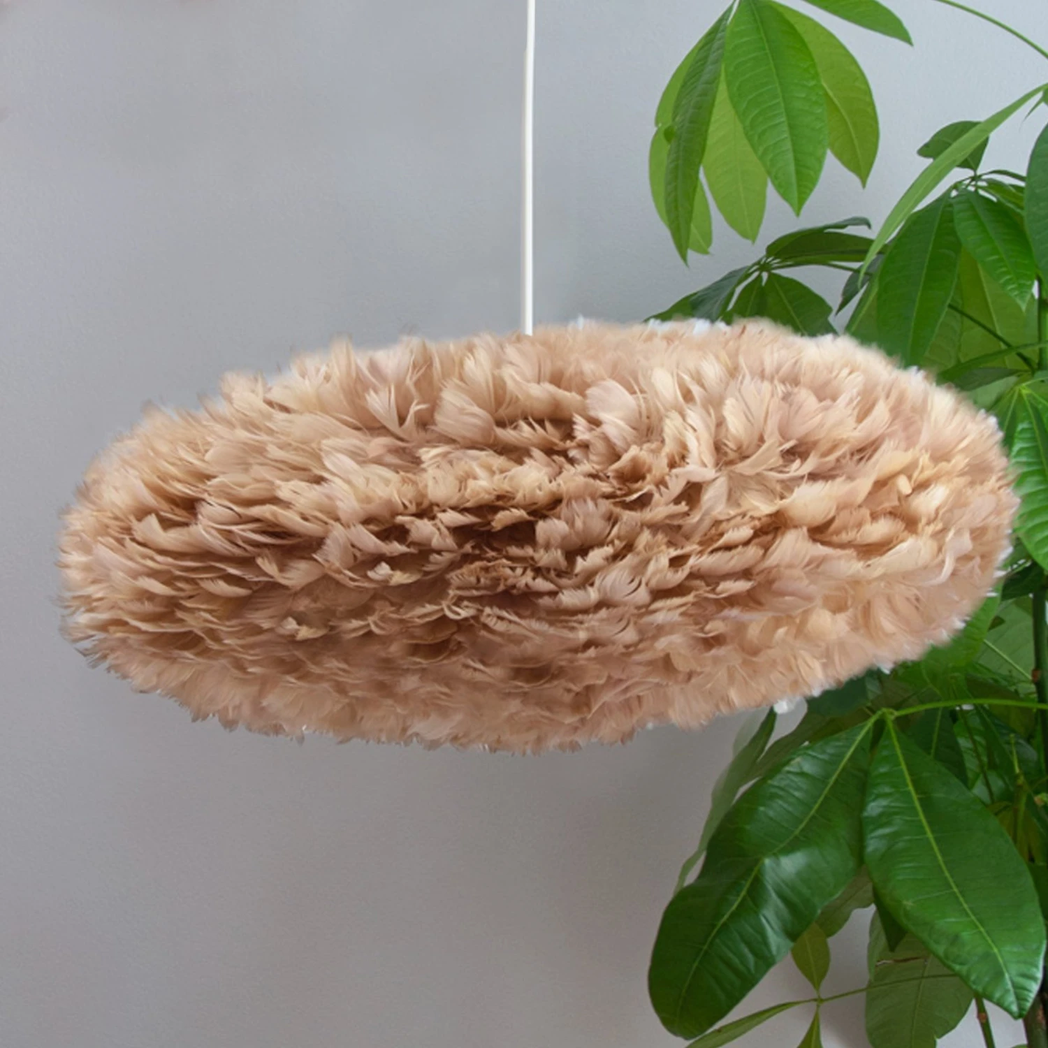 Die aus echten Gänsefedern bestehende Pendelleuchte Eos Esther erhielt ihren Namen aus der griechischen Mythologie. Eos ist die Göttin der Morgendämmerung und so erzeugte der dänische Designer Søren Ravn Christensen bei seinem Entwurf die Verbindung zu den Wolken, die am Himmel schweben – genauso wirkt die Leuchte Eos Esther auf den Betrachter. Eine Wolke, die Leichtigkeit, Reinheit und Zuversicht ausstrahlt. Eos Esther sorgt mit einem mitschwingenden Gefühl der Geborgenheit dafür, dass man sich wohl fühlt und der Raum freundlich erhellt wird. Ihre schlanke und elegante Form prädestiniert sie für einen Esszimmertisch, aber auch im Schlafzimmer sorgt sie mit ihrer Ausstrahlung für Wohlfühlmomente. Der Lichtstrahl tritt rundum in blendfreiem Schein durch die Federn hindurch und sorgt somit für ein angenehmes und stimmungsvolles Ambiente.