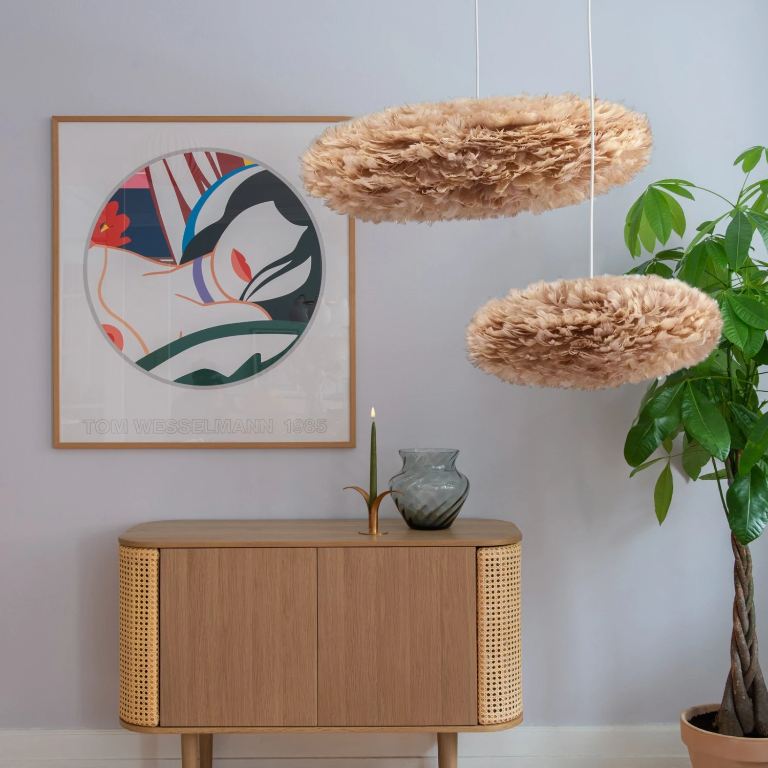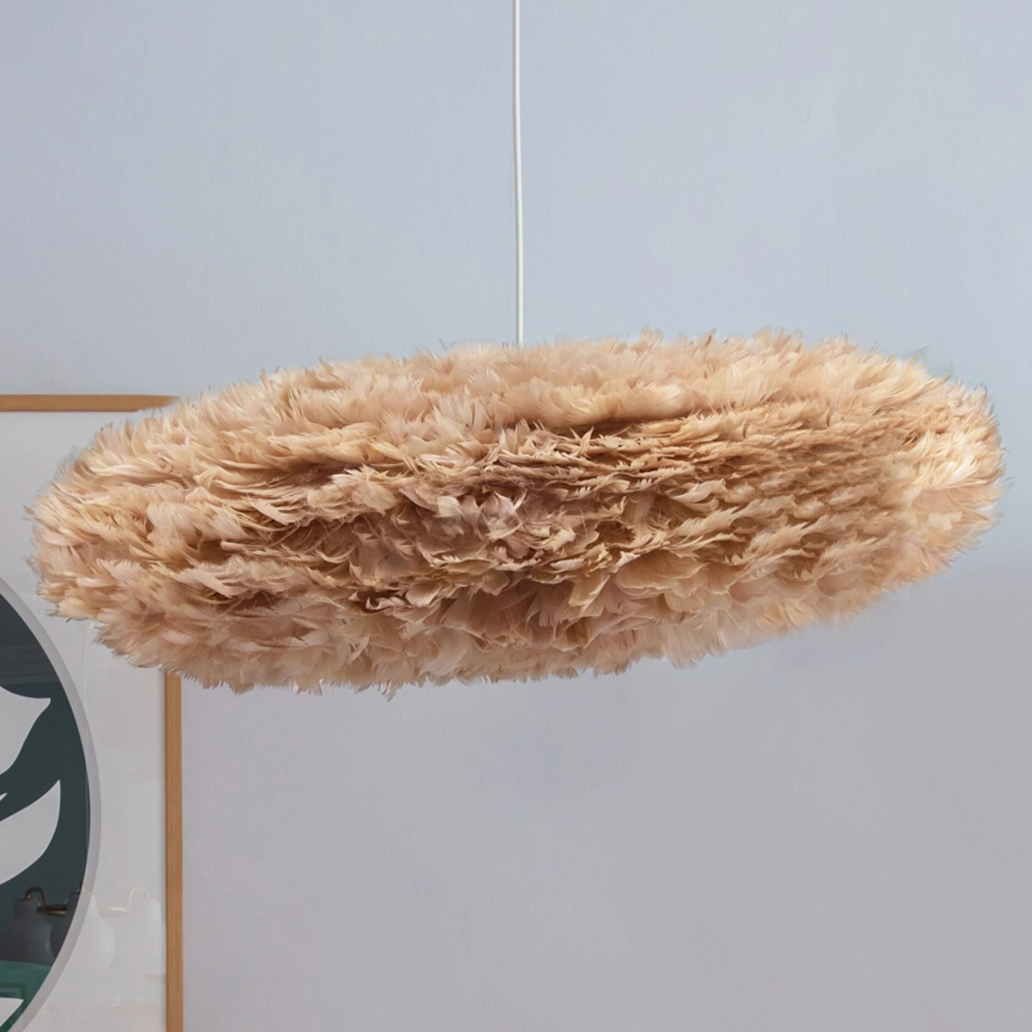Die aus echten Gänsefedern bestehende Pendelleuchte Eos Esther erhielt ihren Namen aus der griechischen Mythologie. Eos ist die Göttin der Morgendämmerung und so erzeugte der dänische Designer Søren Ravn Christensen bei seinem Entwurf die Verbindung zu den Wolken, die am Himmel schweben – genauso wirkt die Leuchte Eos Esther auf den Betrachter. Eine Wolke, die Leichtigkeit, Reinheit und Zuversicht ausstrahlt. Eos Esther sorgt mit einem mitschwingenden Gefühl der Geborgenheit dafür, dass man sich wohl fühlt und der Raum freundlich erhellt wird. Ihre schlanke und elegante Form prädestiniert sie für einen Esszimmertisch, aber auch im Schlafzimmer sorgt sie mit ihrer Ausstrahlung für Wohlfühlmomente. Der Lichtstrahl tritt rundum in blendfreiem Schein durch die Federn hindurch und sorgt somit für ein angenehmes und stimmungsvolles Ambiente.