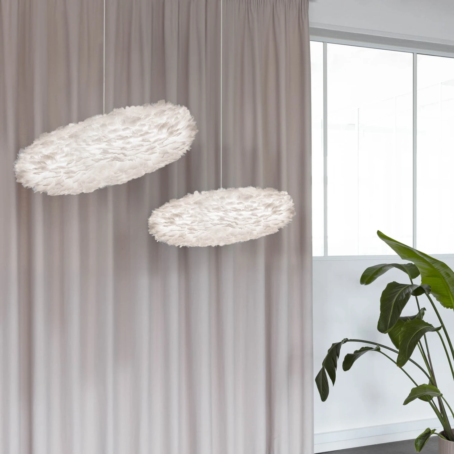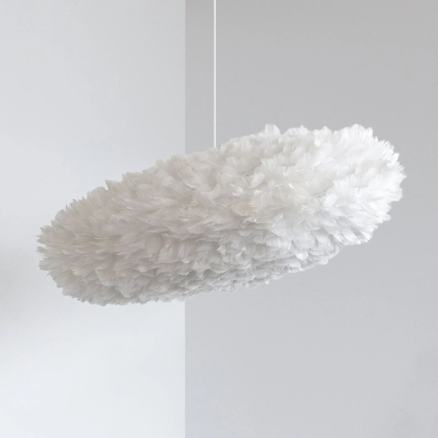 Die aus echten Gänsefedern bestehende Pendelleuchte Eos Esther erhielt ihren Namen aus der griechischen Mythologie. Eos ist die Göttin der Morgendämmerung und so erzeugte der dänische Designer Søren Ravn Christensen bei seinem Entwurf die Verbindung zu den Wolken, die am Himmel schweben – genauso wirkt die Leuchte Eos Esther auf den Betrachter. Eine Wolke, die Leichtigkeit, Reinheit und Zuversicht ausstrahlt. Eos Esther sorgt mit einem mitschwingenden Gefühl der Geborgenheit dafür, dass man sich wohl fühlt und der Raum freundlich erhellt wird. Ihre schlanke und elegante Form prädestiniert sie für einen Esszimmertisch, aber auch im Schlafzimmer sorgt sie mit ihrer Ausstrahlung für Wohlfühlmomente. Der Lichtstrahl tritt rundum in blendfreiem Schein durch die Federn hindurch und sorgt somit für ein angenehmes und stimmungsvolles Ambiente.