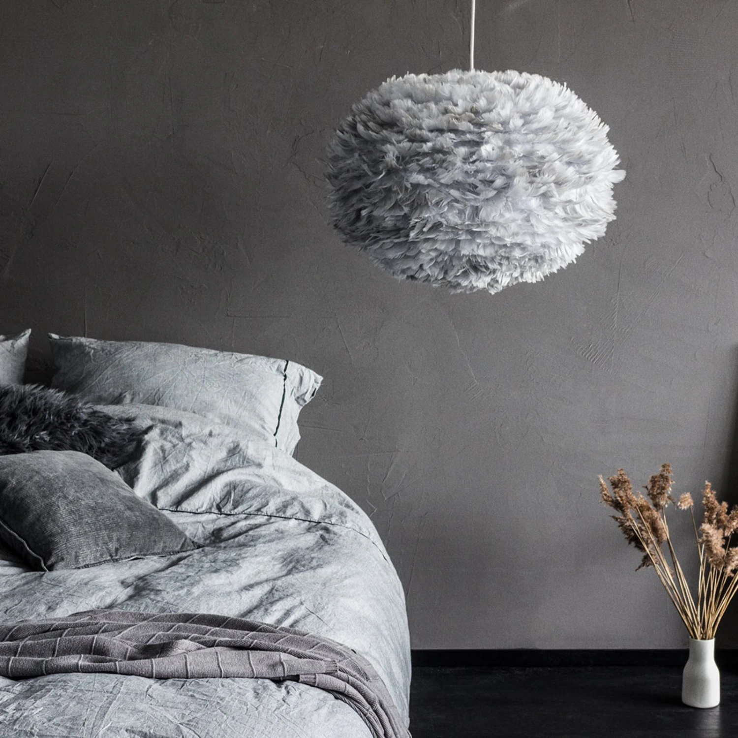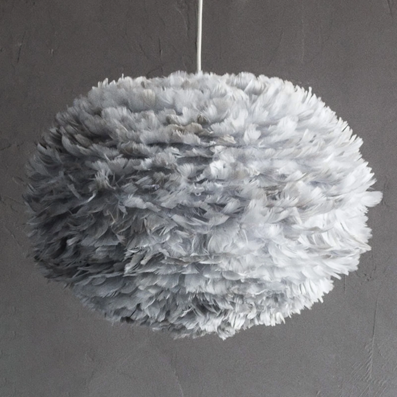 Die Pendellampe Eos large fällt überall sofort in den Blick, was zum einen an ihrer ungewöhnlichen Optik und zum anderen an ihrer fantastischen Lichtwirkung liegt. Beides hat sie ihrem Schirm und dem natürlichen Material, das dafür verwendet wurde, zu verdanken. Der hellgraue Schirm besteht aus ca. 4.500 natürlichen Gänsefedern. So wird Eos large sowohl ausgeschaltet als auch beleuchtet zum echten Highlight.