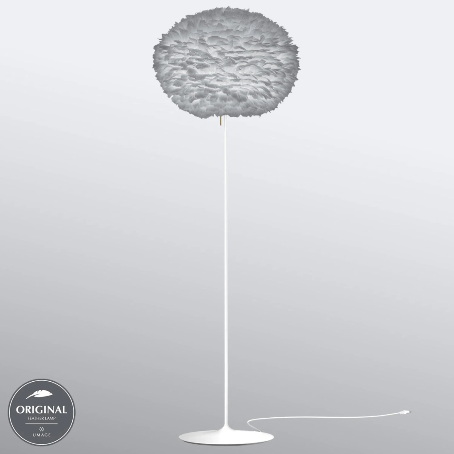 Die Stehlampe Eos large präsentiert sich als absoluter Hingucker, was in erster Linie an der ungewöhnlichen Schirmgestaltung liegt. Auf eine Papierunterlage wurden ca. 4.500 Gänsefedern aufgeklebt. So entstand ein Schirm, der sehr flauschig wirkt, weshalb Eos large auch unbeleuchtet ein behagliches Ambiente schafft.