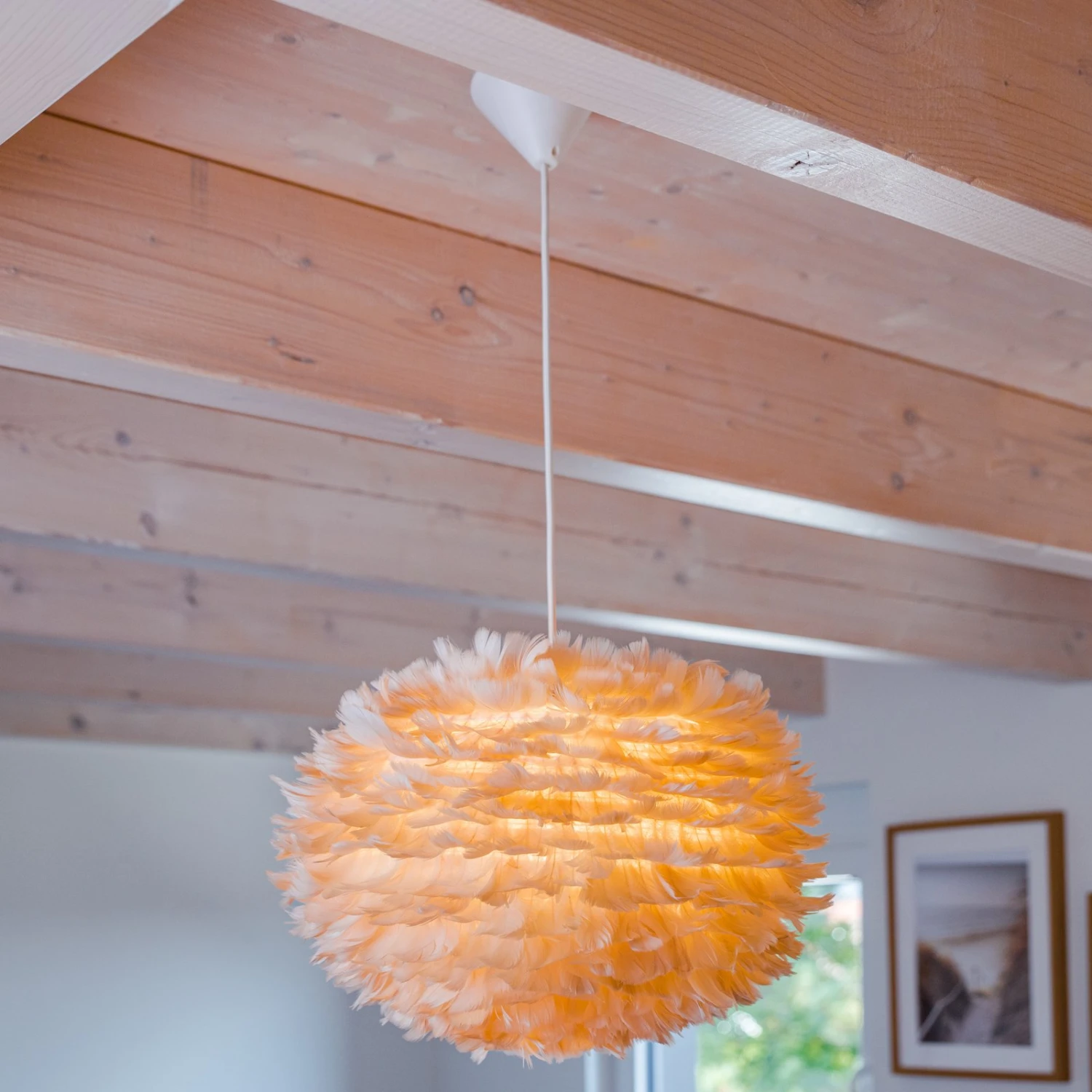 Die Farbe der Federn verleiht dem abstrahlenden Licht des eingesetzten Leuchtmittels zusätzliche Weichheit. So entsteht eine Lichtwirkung, die in jedem Raum, in dem Eos medium eingesetzt wird, angenehm auffällt, da sie eine sehr gemütliche Atmosphäre schafft. Eos medium eignet sich z. B. hervorragend als Lichtquelle über dem Esstisch oder als Umgebungsbeleuchtung im Sitzbereich des Wohnzimmers.