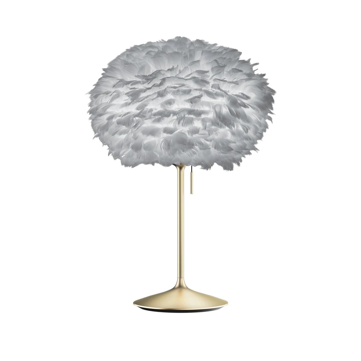 Tischleuchte Eos medium – flauschiger Federschirm auf Metallgestell in messing