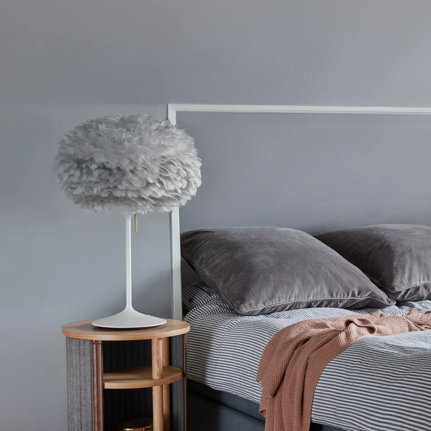 Duftig und flauschig wirkt der Schirm der Tischleuchte Eos medium, denn er ist mit echten Gänsefedern rundum gearbeitet, was der Leuchte eine einzigartige und dekorative Wirkung und dem Licht Behaglichkeit verleiht. Die Tischleuchte wirkt in nahezu jedem Einrichtungsstil bezaubernd und stellt eine wirkungsvolle Dekoration in vielen Bereichen dar.