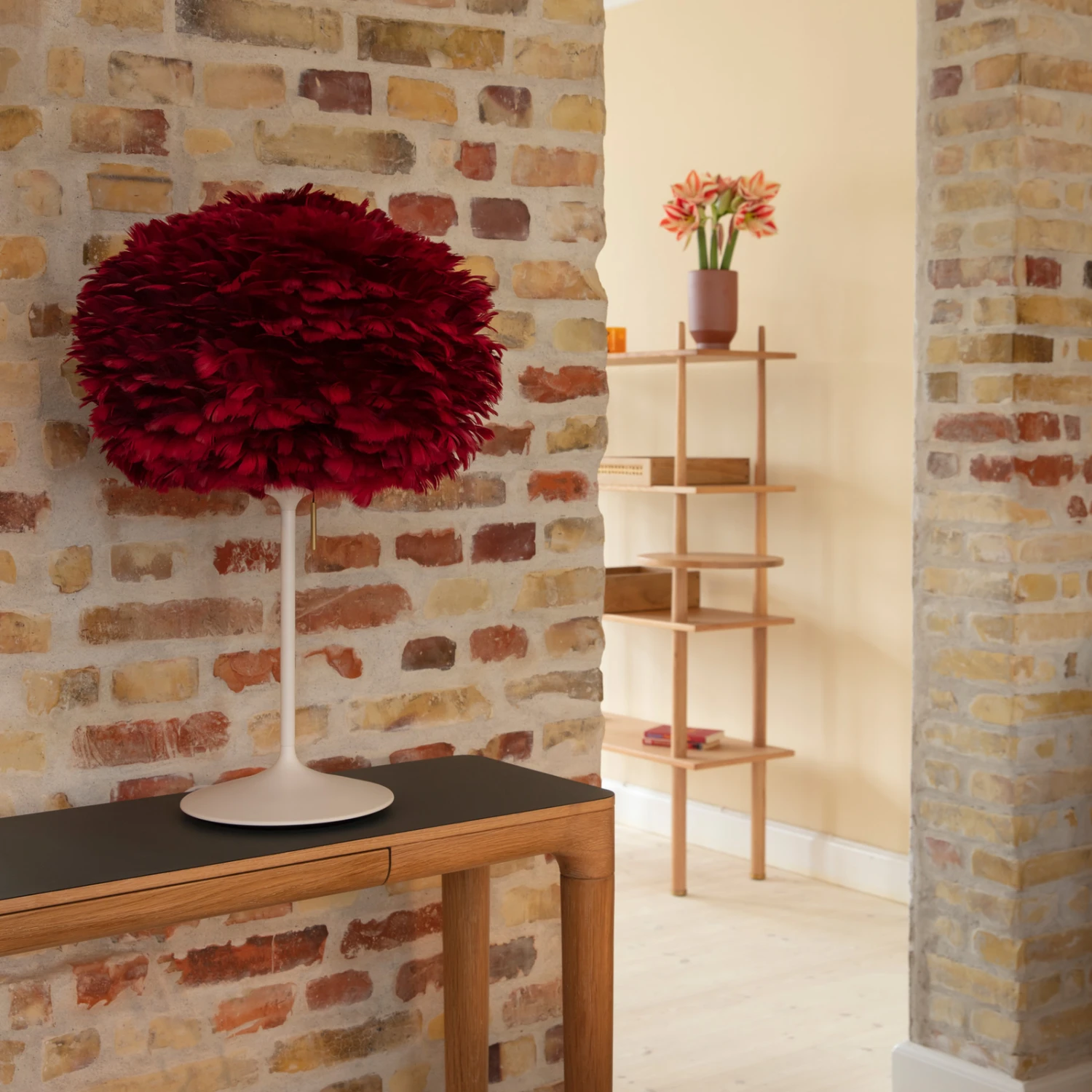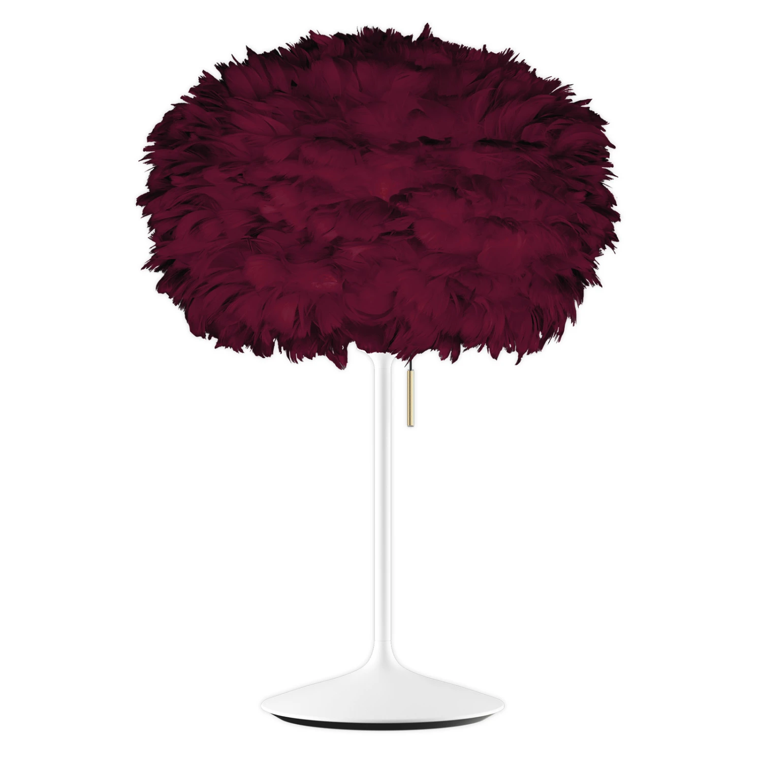 Einen unvergleichlichen Anblick bietet die Tischleuchte Eos mini dank des Schirms aus natürlichem Material. Er besteht aus Gänsefedern, die von Hand auf einem Untergrund aus Pappe aufgebracht wurden. Für die Schirmgestaltung werden keine Federn lebender Tiere verwendet. Der Schirm Eos mini wurde von Søren Ravn Christensen designt, dem Mitbegründer der dänischen Herstellerfirma UMAGE und lässt sich mit verschiedenen Gestellen kombinieren, in diesem Fall wurde ein von Anders Klem gestaltetes Gestell verwendet. Dessen Form wurde unübersehbar dem Fuß einer Champagnerflöte nachempfunden. Es strahlt Leichtigkeit und pure Eleganz aus und ergibt im Zusammenspiel mit dem Schirm Eos mini eine Tischleuchte, die jedem modernen Wohndesign das gewisse Etwas verleiht.