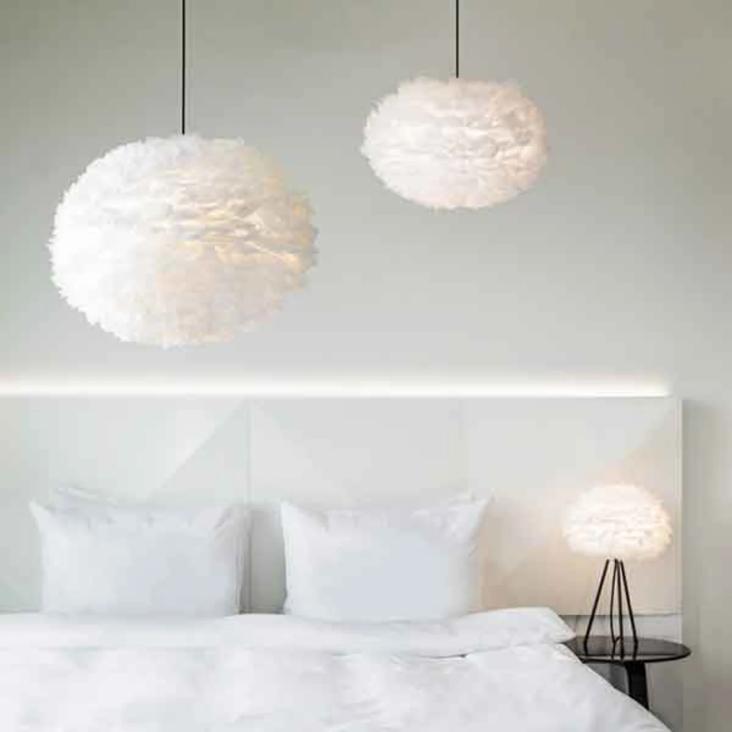 Eos Mini gibt ein warmes, weiches Licht ab, das durch die vielen Federn sanft hindurch scheint und den Raum in eine angenehme Atmosphäre versetzt. Durch die Möglichkeit, das E27-Leuchtmittel selbst zu wählen, kann man die Lichtwirkung beeinflussen und optimal auf die eigenen Vorlieben abstimmen. Durch den Schalter am Kabel ist eine bequeme Bedienung der Tischlampe gewährleistet.