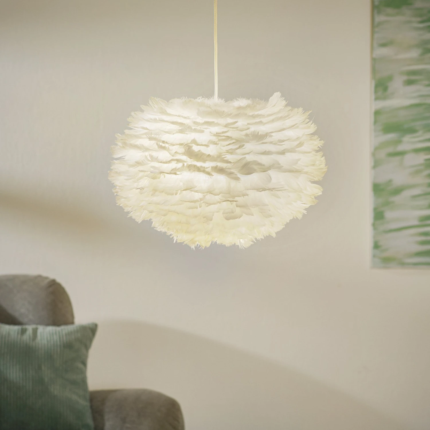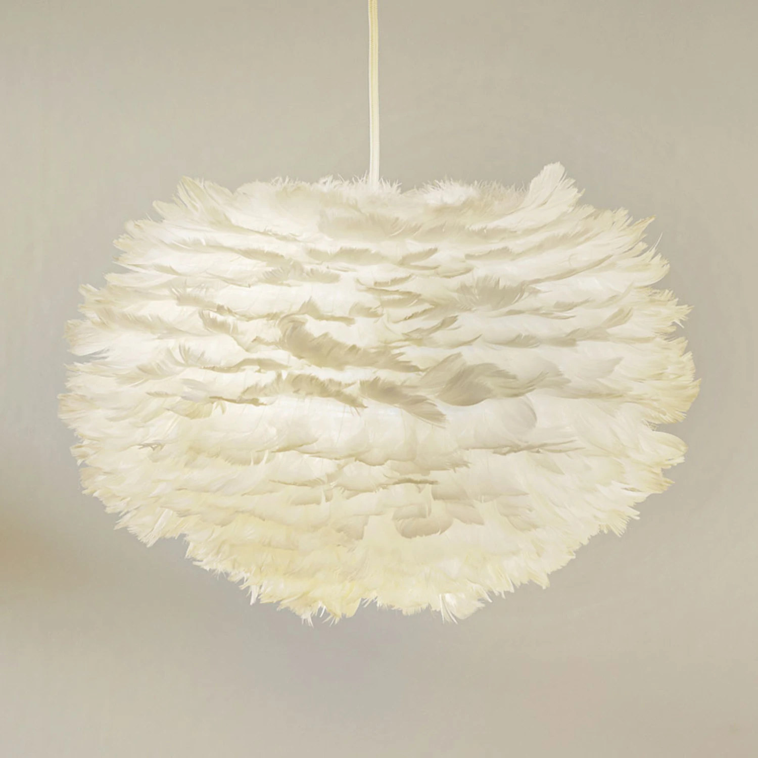 Weiße Pendellampe Eos medium mit Schirm aus Gänsefedern