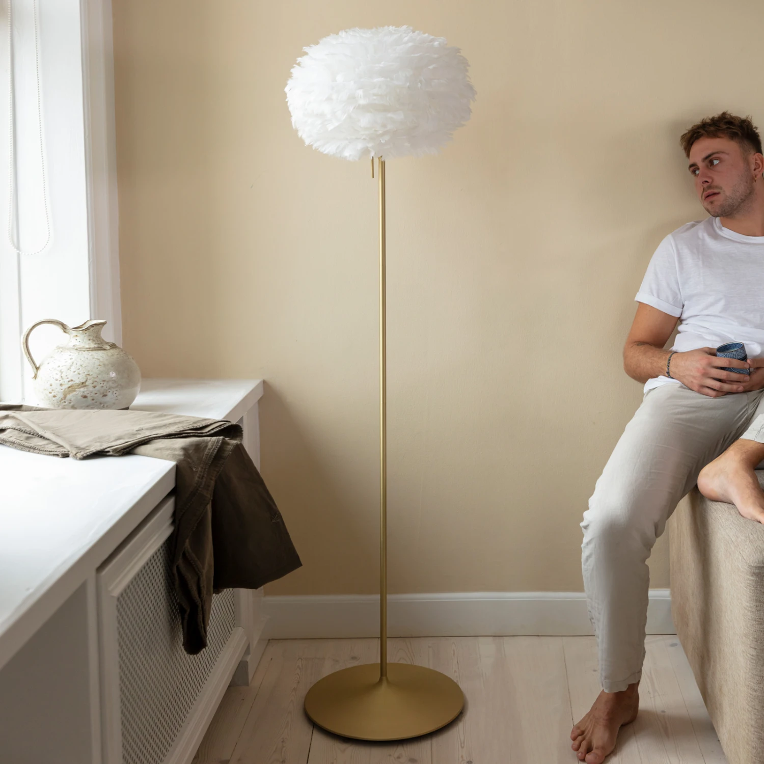 Diese Stehleuchte ist die gelungene Kombination von Designelementen zweier dänischer Designer. Der Schirm Eos medium ist komplett aus echten Gänsefedern gearbeitet, wobei betont werden muss, dass keine Federn lebender Tiere verwendet werden. Er ist eine Schöpfung von Søren Ravn Christensen, dem Mitbegründer und Chefdesigner der Herstellerfirma UMAGE. Eos medium verleiht dem abstrahlenden Licht eine besondere Wirkung, die entscheidend zur Behaglichkeit im Raum beiträgt. Das edle Messing-Gestell von Anders Klem ist die ideale Ergänzung zu Eos medium. Es steht durch seine dekorative Form, die dem Stiel eines Champagnerglases nachempfunden ist, dem Schirm an Eleganz in nichts nach. Eine unschlagbare Kombination, die in jedem Raum zum Eyecatcher wird.