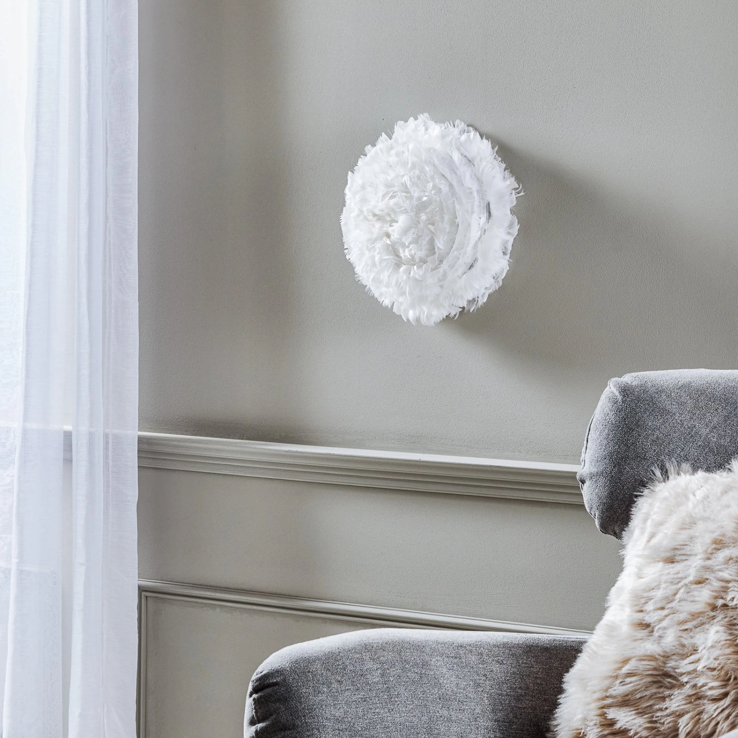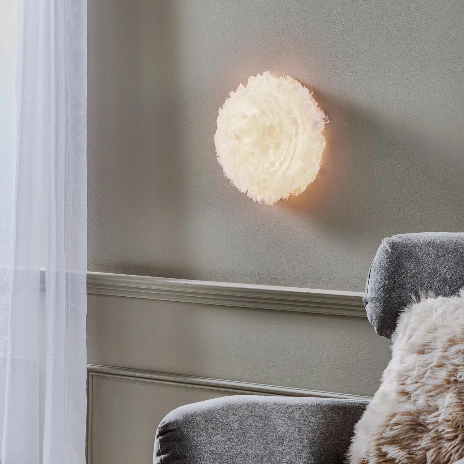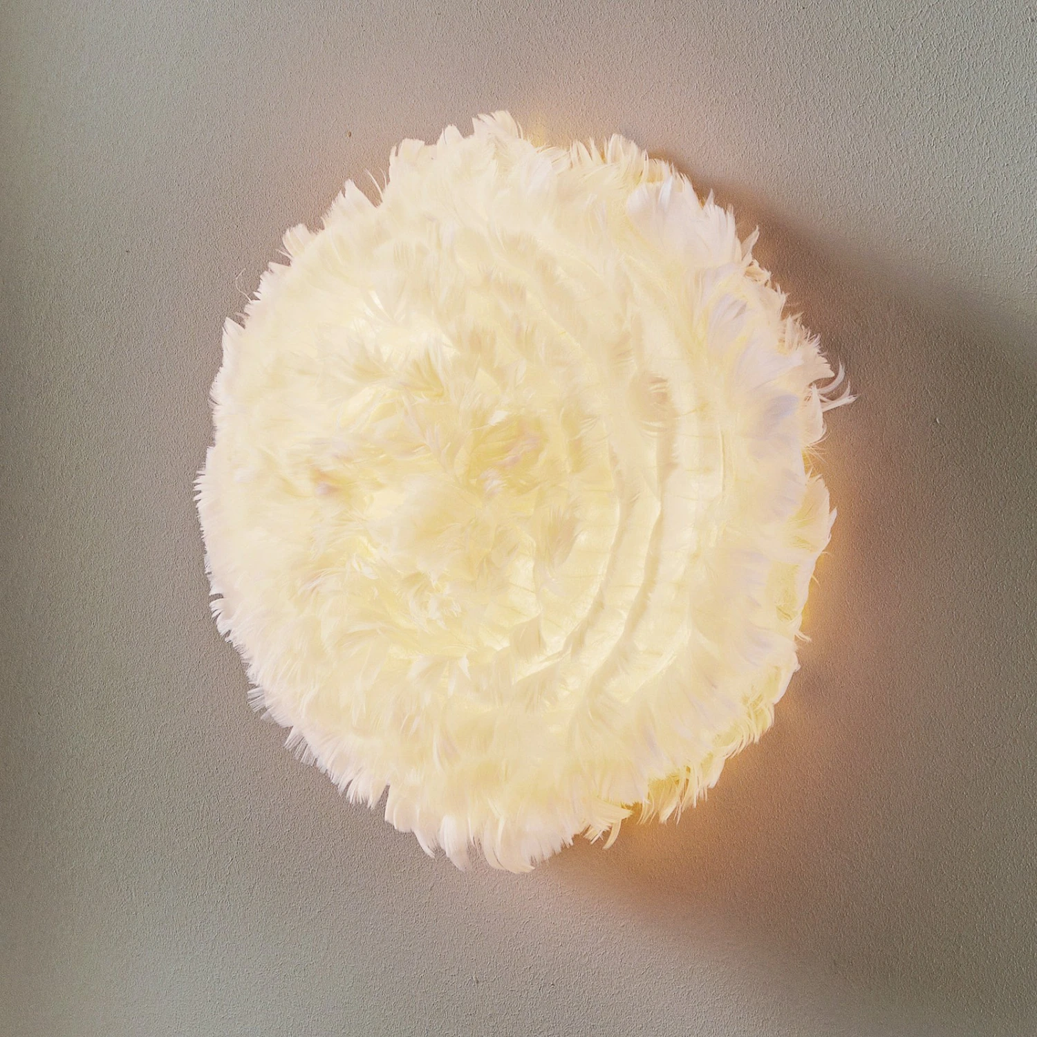 Die Eos Up Leuchte von dem dänischen Leuchtenhersteller UMAGE ist aus echten Federn hergestellt. Diese sorgen mit ihrer Natürlichkeit und ihrer Weichheit für eine besonders dekorative Optik und für eine sehr angenehme Lichtatmosphäre. Gerade für Schlafzimmer, in Wohnräumen oder auch im Kinderzimmer sorgt die Wandleuchte Eos Up mini für einen besonderen Blickfang. Verwendet werden hier keine Federn noch lebender Tiere.