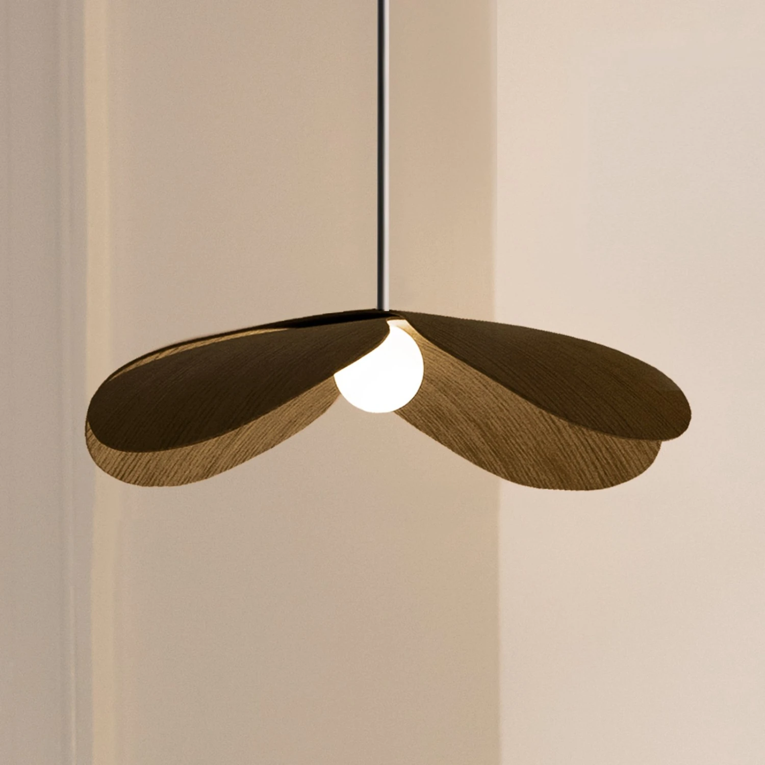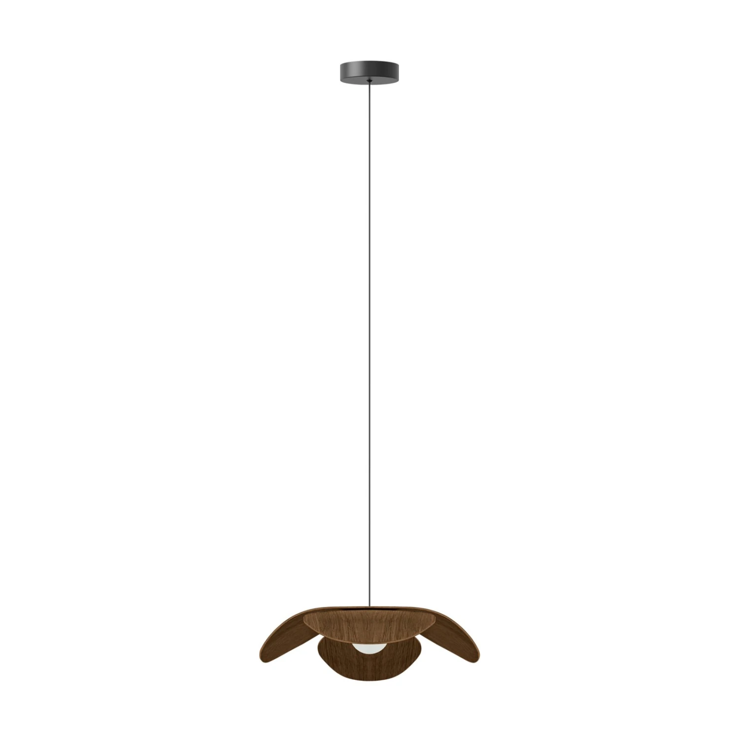 Der Schirm der Leuchte besteht aus Eichenholzfurnier. Dieses bildet die Blütenblätter des Vergissmeinnichts. In der Mitte der „Blüte“ befindet sich ein kugelrunder Diffusor aus Kunststoff, der das Licht blendfrei im Raum verteilt. Die Pendelleuchte kann einzeln oder auch zu mehreren nebeneinander aufgehängt werden, so dass z. B. ein großer Esszimmertisch oder eine Theke ausgeleuchtet werden können.