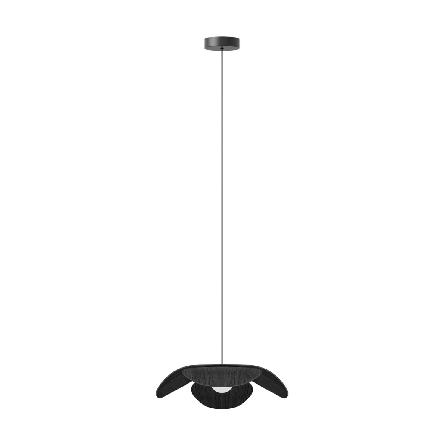 Der Schirm der Leuchte besteht aus Eichenholzfurnier. Dieses bildet die Blütenblätter des Vergissmeinnichts. In der Mitte der „Blüte“ befindet sich ein kugelrunder Diffusor aus Kunststoff, der das Licht blendfrei im Raum verteilt. Die Pendelleuchte kann einzeln oder auch zu mehreren nebeneinander aufgehängt werden, so dass z. B. ein großer Esszimmertisch oder eine Theke ausgeleuchtet werden können.