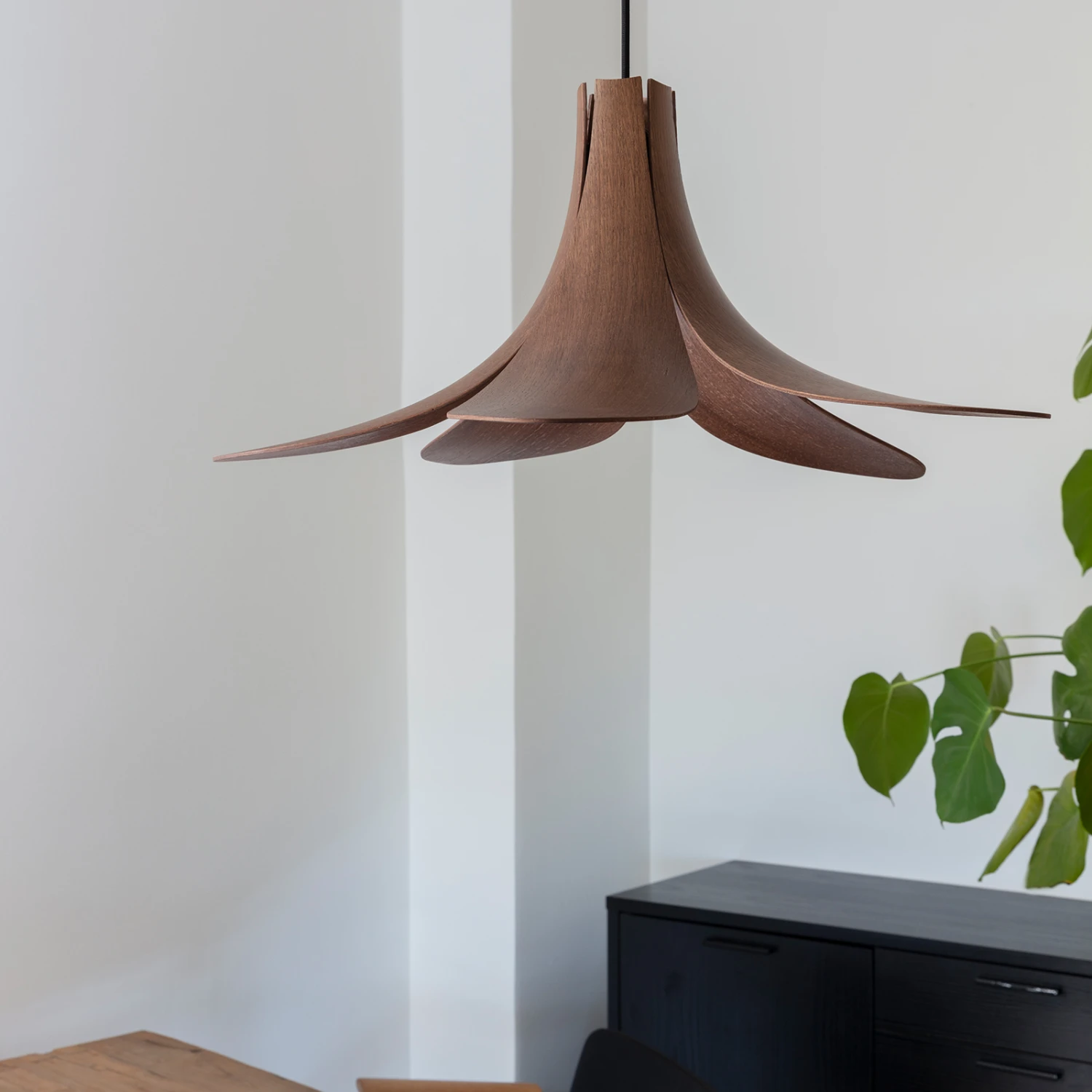 Das Hauptaugenmerk liegt auf dem Lampenschirm dieser Pendelleuchte. Er ist aus robustem Eichenholz gefertigt und zeigt sich mit geschwungenen, formvollendeten Linien, die fließend ineinander übergehen. Beim Entwurf der Form ließen sich die beiden dänischen Designer Magnus Nero und Ingemar Jönsson von einem klassischen Grammophon Horn und der wunderschönen Frangipani-Blume inspirieren. Daher auch die fünf ausladenden „Blätter“ die optisch eine Blüte zu formen scheinen.