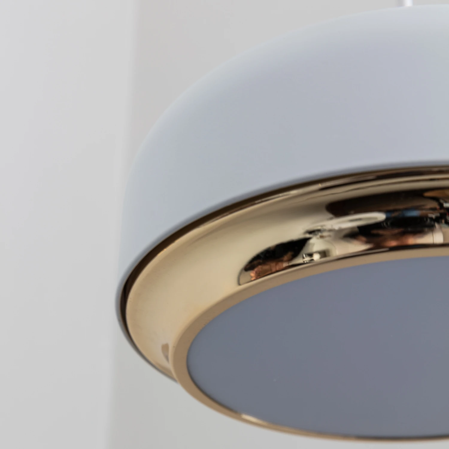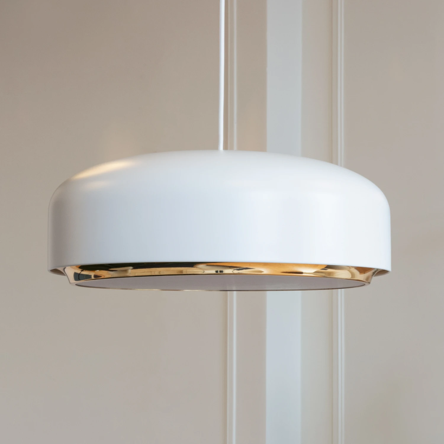 Das Modell Hazel aus dem Hause UMAGE hat einen runden, weißen Stahlschirm, der am unteren Rand von einem messingfarbenen Abschluss gekrönt wird, der dem Design einen besonderen Ausdruck verleiht. Die warmweißen LEDs sind von einem Diffusor abgedeckt, so dass das Licht blendfrei nach unten abgegeben wird. Hazel ist in Kombination mit einem externen Dimmer (nicht inklusive) dimmbar.