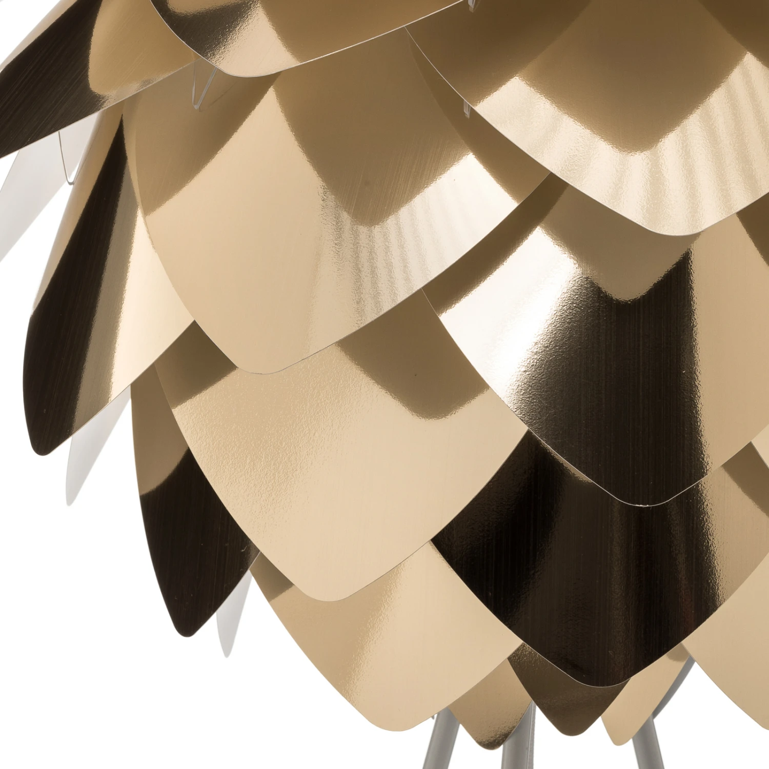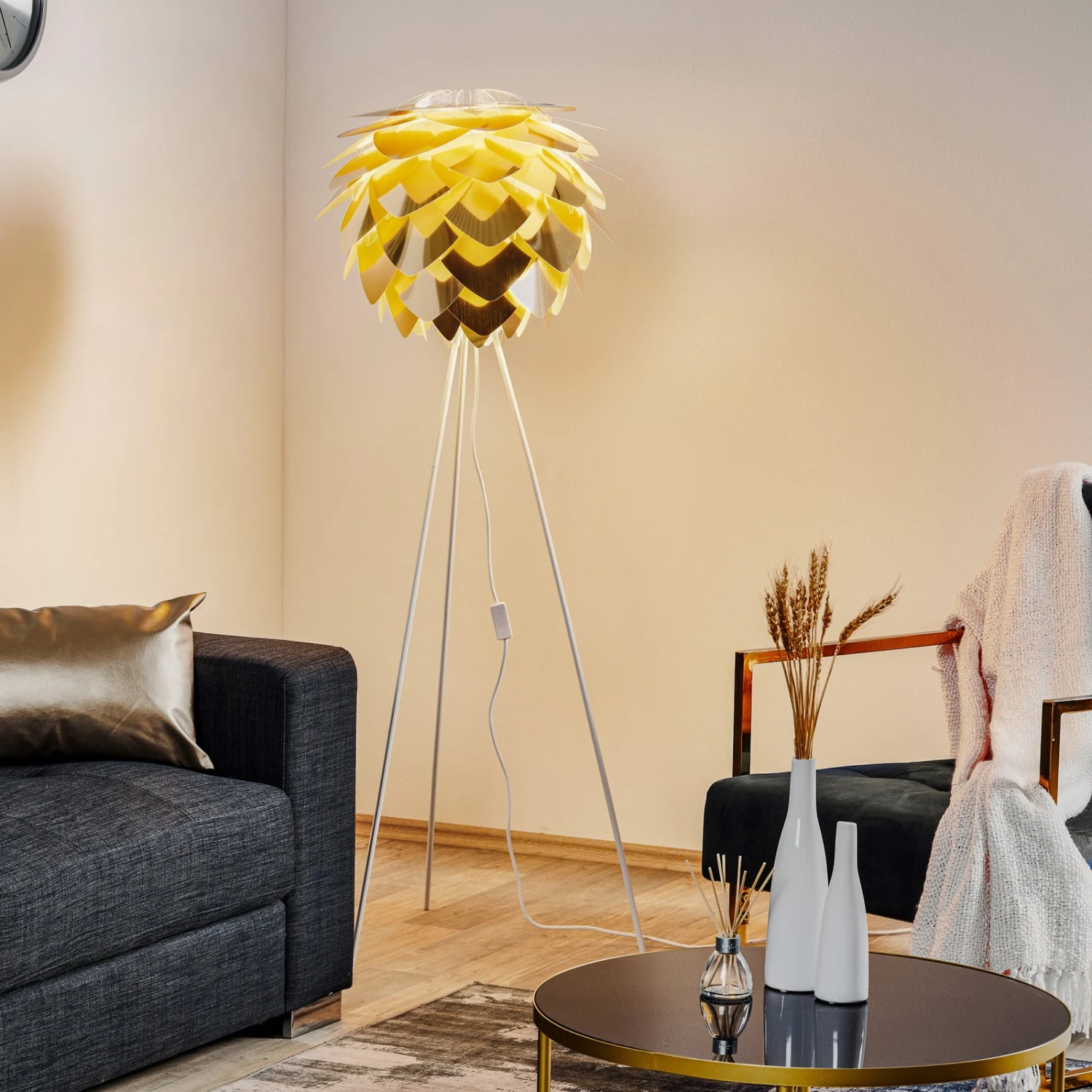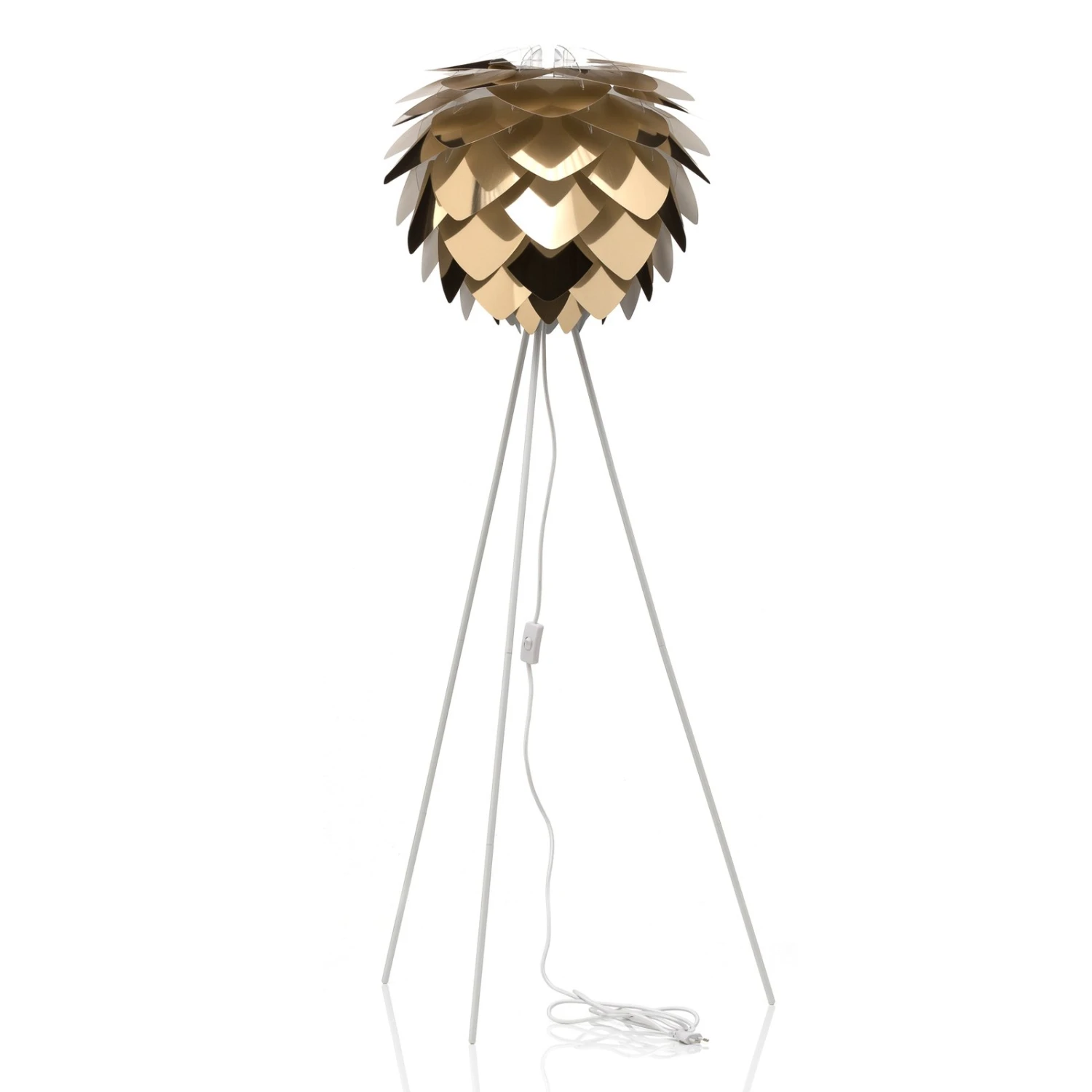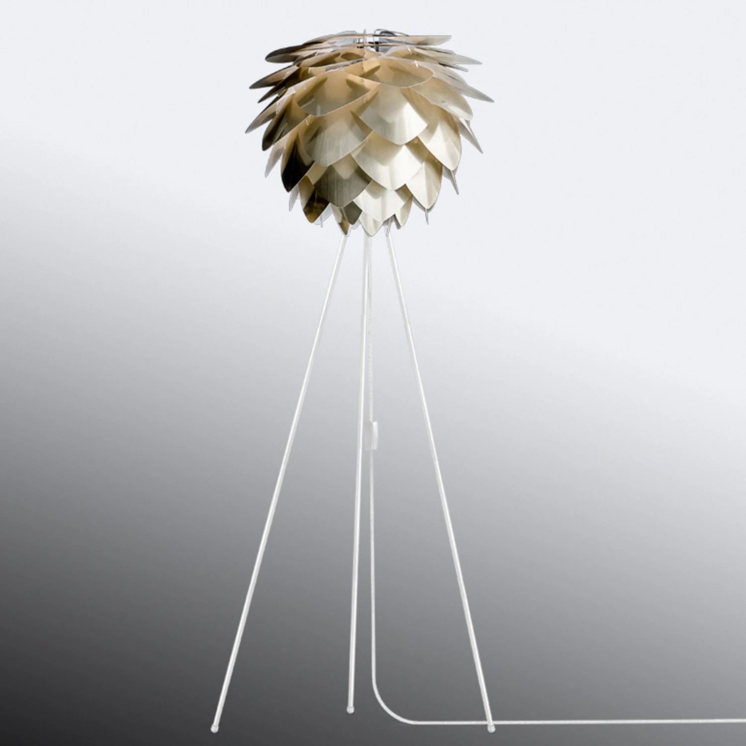 Der Schirm der Stehleuchte Silvia medium ähnelt einer Pflanze und wird durch die Farbe Messing vor allem bei eingeschalteter Beleuchtung besonders in seiner exotischen Schönheit betont. Der Schirm des Vita Design Teams wird durch die Verbindung mit dem von Søren Ravn Christensen gestalteten dreibeinigen, weiß lackierten Leuchtengestell zu einem Lichtspender, der nicht nur als Lichtquelle dient, sondern auch unbeleuchtet zum Eyecatcher im Wohnraum wird.
