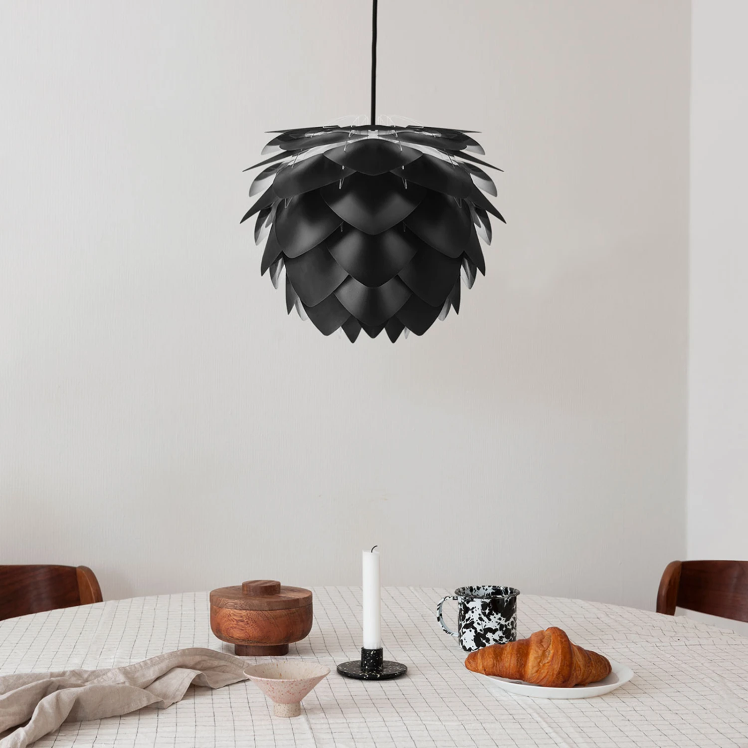 Dank der durchgehend schwarzen Färbung der Pendelleuchte Silvia wird der Leuchte ein ganz besonderer Charakter zugesprochen. Schwarz wirkt geheimnisvoll, weckt die Neugierde und lässt ein Gefühl von Unendlichkeit mitschwingen. Als Gegensatz zur reinen weißen Farbe ist diese schwarze Leuchte keinesfalls trostlos. Durch die aufregende Anbringung der organisch wirkenden, dreieckigen Blätter wird eine bezaubernde Struktur geschaffen, die Licht und Schatten gleichermaßen zulässt. Die Lichtverteilung aus dem dunklen Inneren heraus über die unterschiedlichen Strukturen sorgt für fesselnde Augenblicke und hüllt die Umgebung in eine beruhigende Atmosphäre. Die elegante und zugleich schlichte Wirkung der Hängelampe Silvia verkörpert durch die gleichmäßige Anbringung der Komponenten, die den Schirm formen, eine gewisse Ordnung, sie lässt sich so problemlos in moderne Einrichtungsstile integrieren. Silvia ist ein- und ausgeschaltet ein wahrer Eyecatcher. Der schwarze Schirm wird durch den schwarzen Deckenbaldachin und das Textilkabel optimal komplettiert.
