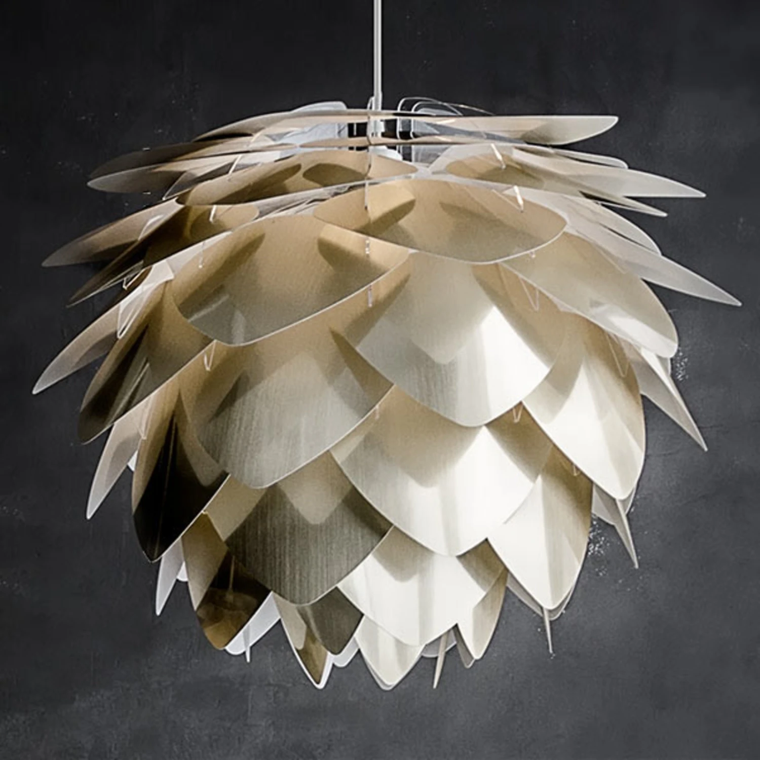 In der Gesamtansicht wirkt der Schirm wie eine exotische Frucht, was alleine schon ausreicht, um von Wärme und Licht zu träumen. Bei Silvia bleibt es jedoch kein Traum: Ihre Lichtwirkung ist einfach fantastisch und bewirkt ein sehr gemütliches Ambiente im Raum, egal, ob sie zur Haupt- oder zur Bereichsbeleuchtung eingesetzt wird.